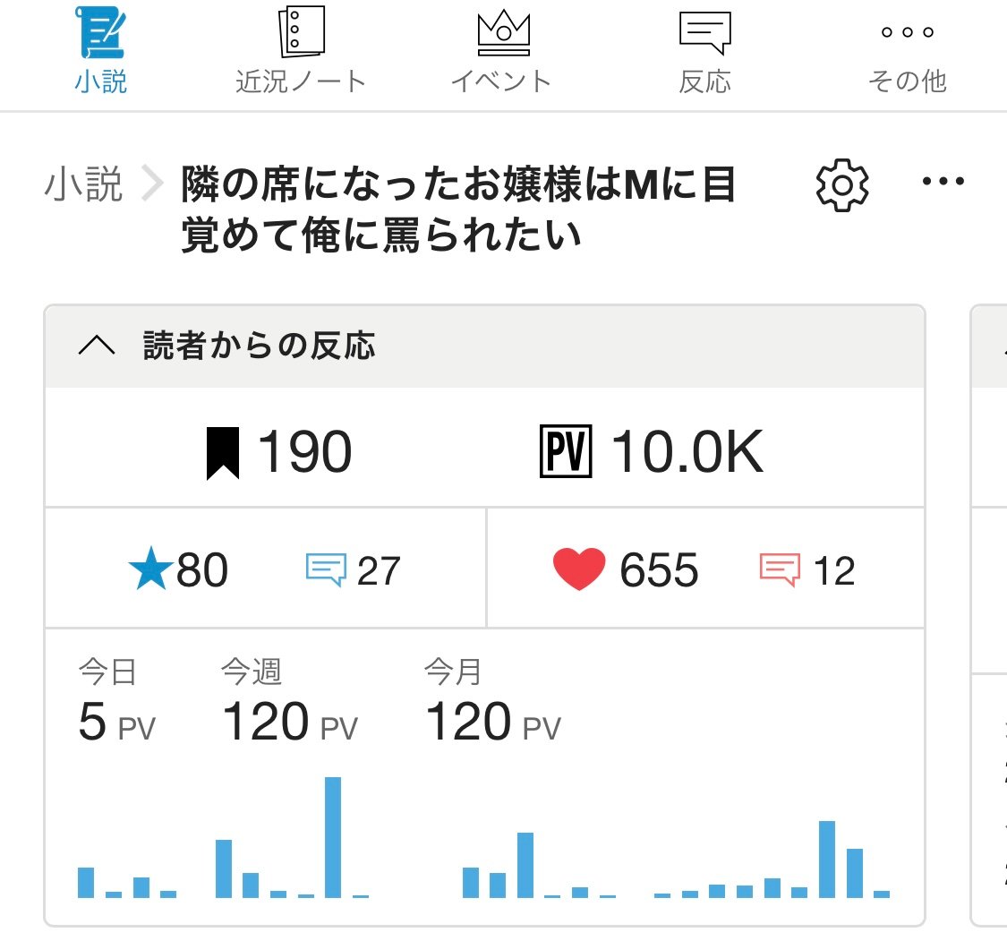 https://kakuyomu.jp/works/16818792438749305520 あと昨日、完結済みの拙作【隣の席になったお嬢様はMに目覚めて俺に罵られたい】が1万PVを超えました。ひとえにお読みいただいたお客様のお陰です、本当にありがとうございます。代表作以外の読まれ方はほぼどっこいですが(途中で放り投げた作品は除く)、少しずつでも読んで貰えていると思うと嬉しくなります((((´Д` ))))