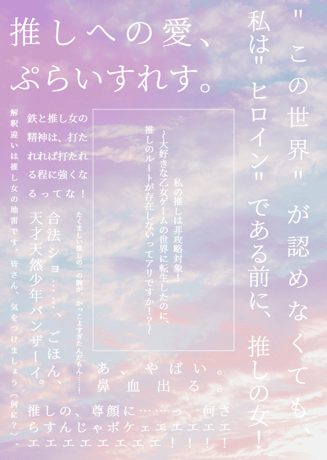 とはいえ、ネット小説での乙女ゲーム世界観というよりは、リアルの乙女ゲームの世界観を基に制作したストーリーとなっています。なので悪役令嬢とかは出ないタイプです。代わりに頭の悪いオタクが出ます。モデルは私です。