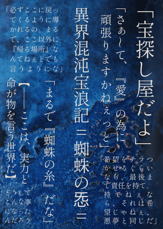 というわけで、毎週土曜日19時投稿の『異界混沌宝浪記=蜘蛛の㤅=』、『謎提示編』をよろしくお願いいたします!