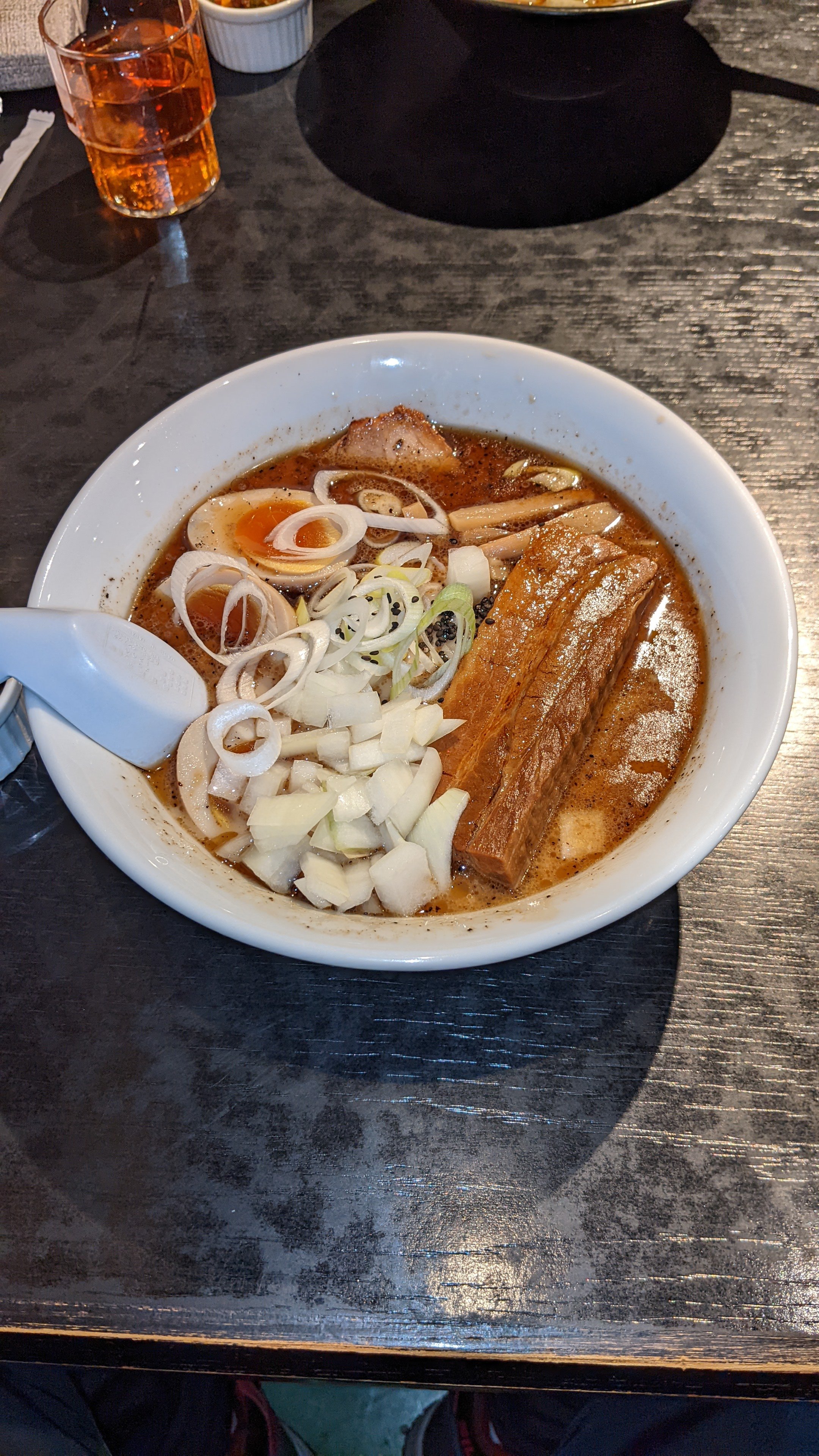黒とんこつラーメン玉ねぎと角煮と煮卵トッピングバージョン、前回写真に収められなかったが、今回はしっかり収めてみた😃