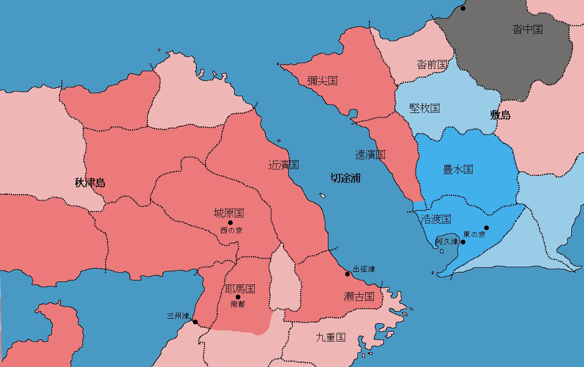 秋津洲は基本的に全域が西京陣営に属します。但し勢力が大きい分、内部での権力争いが熾烈で、そもそも東西分裂状態を引き起こした原因もこの権力争いに因るものです。