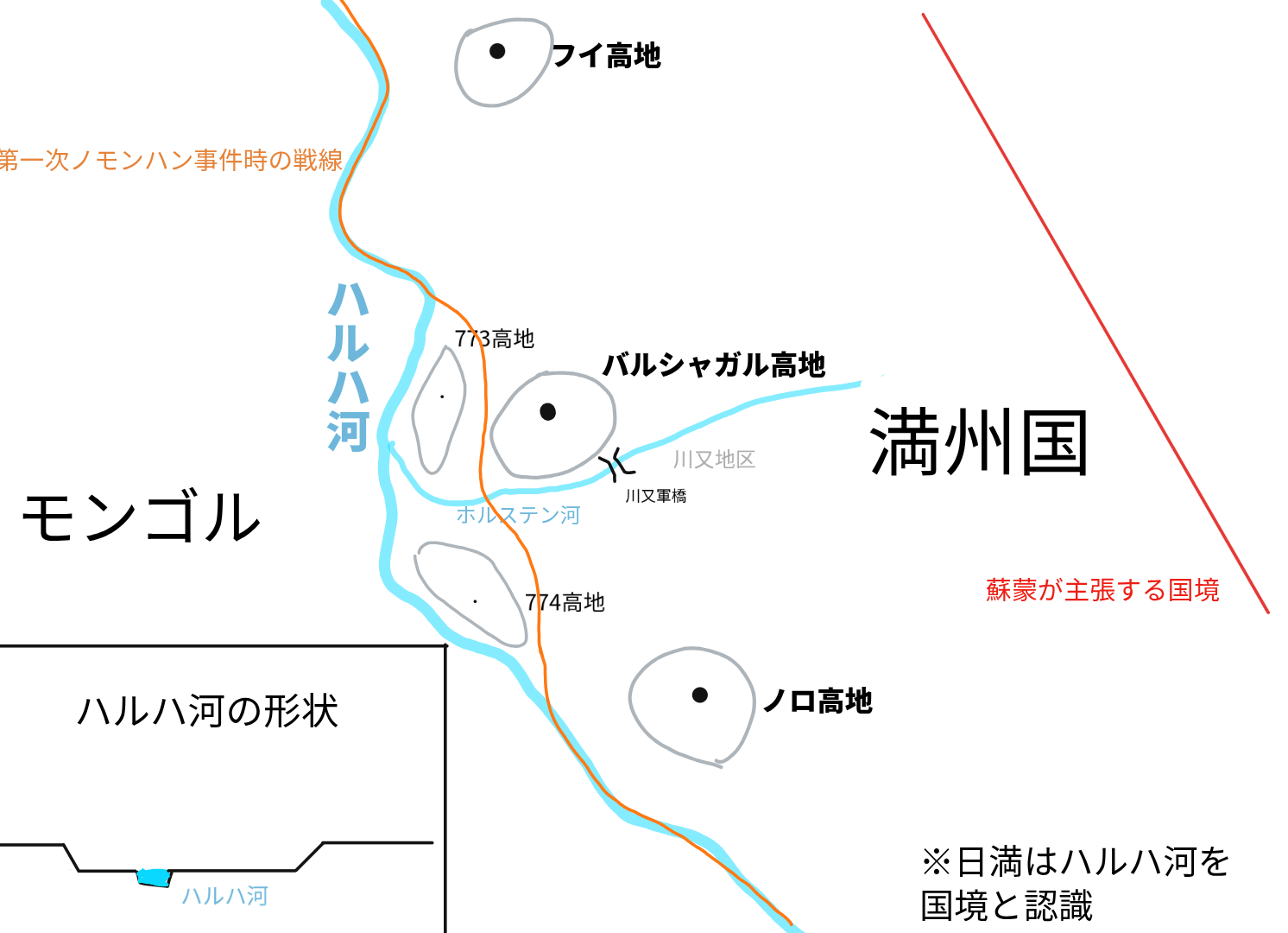 今更ですが、ノモンハン周辺の地図です。うろ覚えなので位置関係など間違っている箇所もあるかもしれませんが、あくまでも参考程度ですのでご了承下さい。