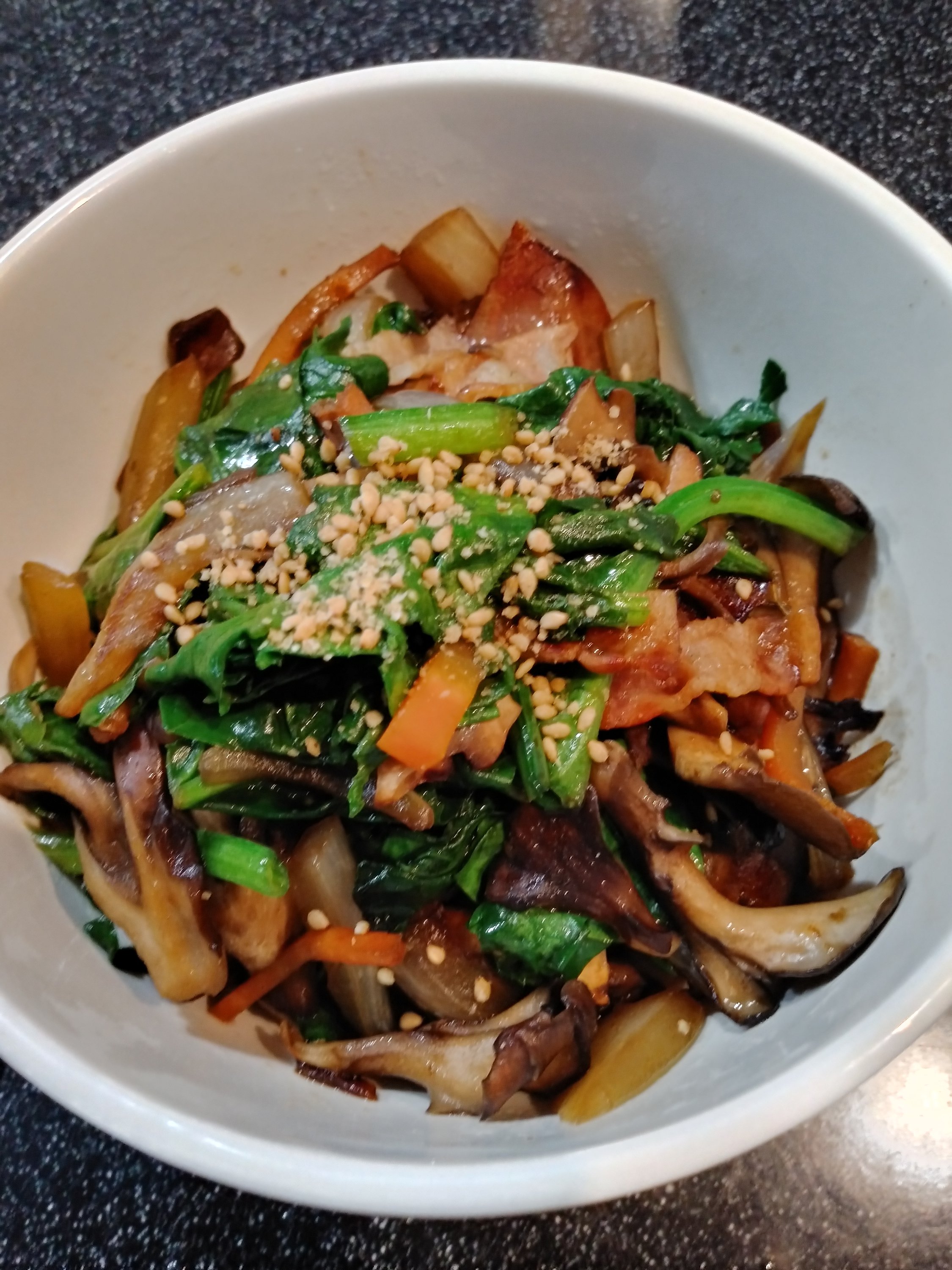 これはホウレンソウ、キノコ、ベーコン、ニンジン、タマネギ?等の炒め物でしょう。