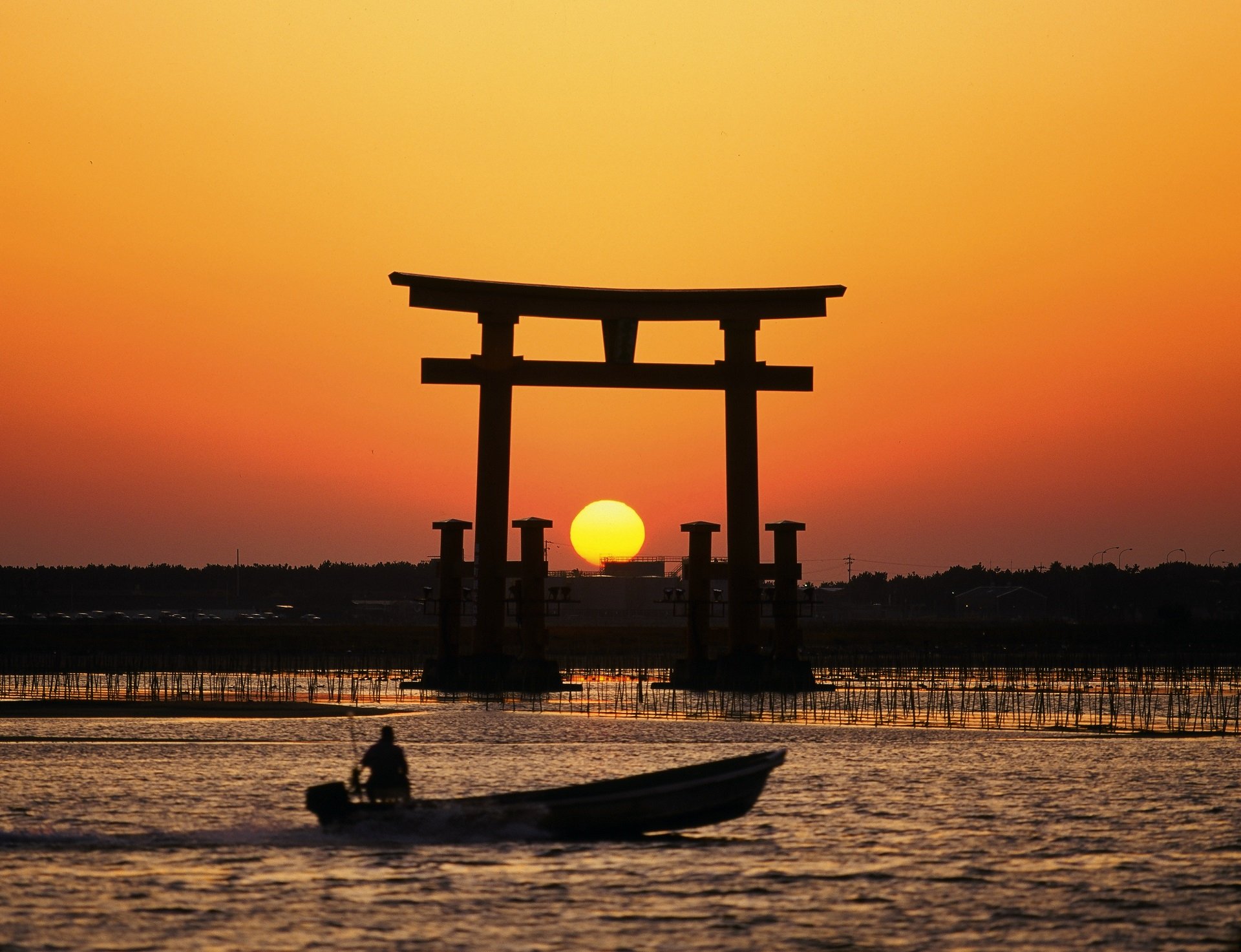 素晴らしい構図、夕日を中心に鳥居も赤く染まる空も手前の漁師の舟のシルエットも完璧です!