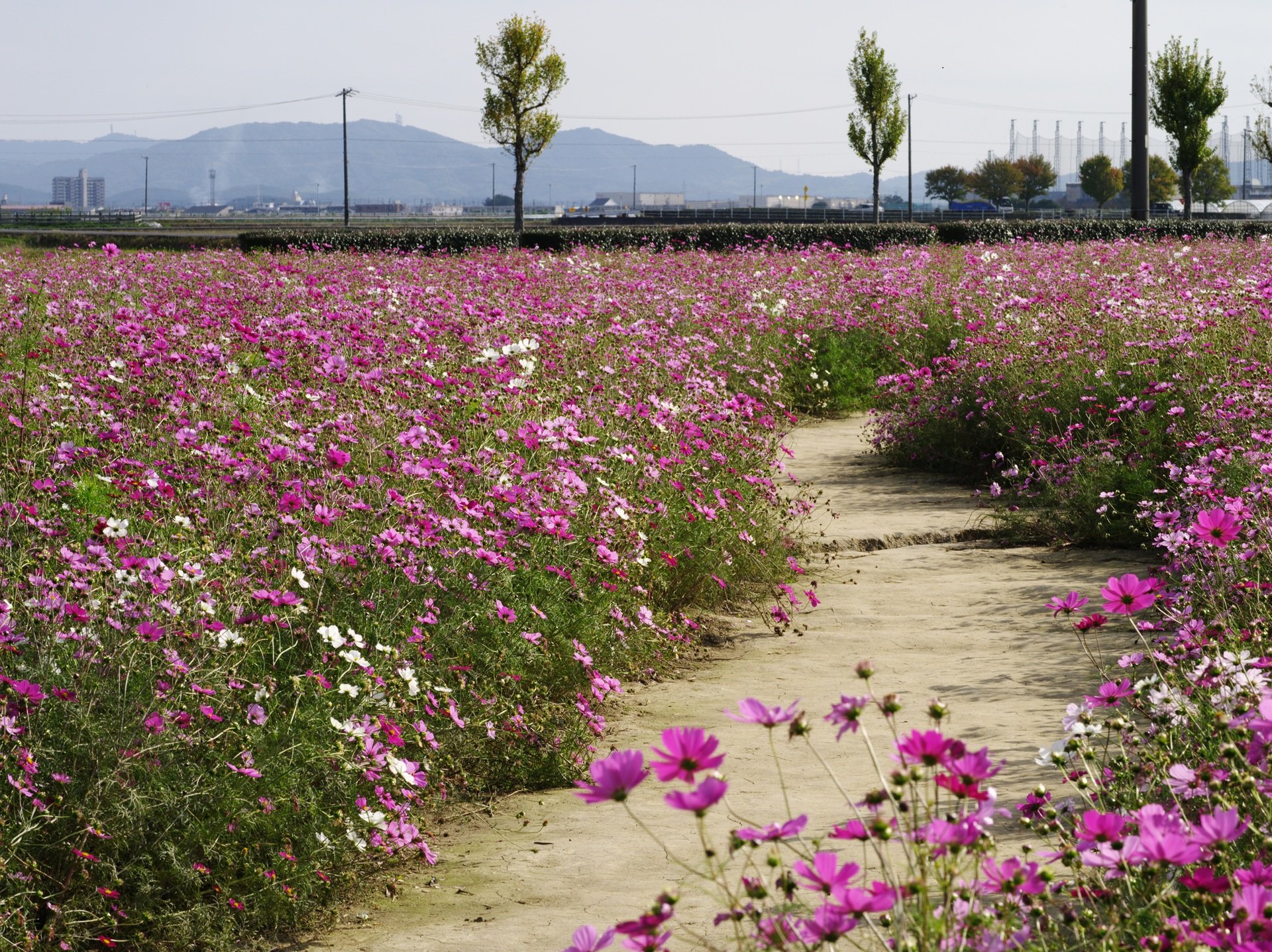 安城市内のフラワーロード沿いにある赤松町のコスモス畑は、コスモス畑の中の散策路を歩くことが出来ます