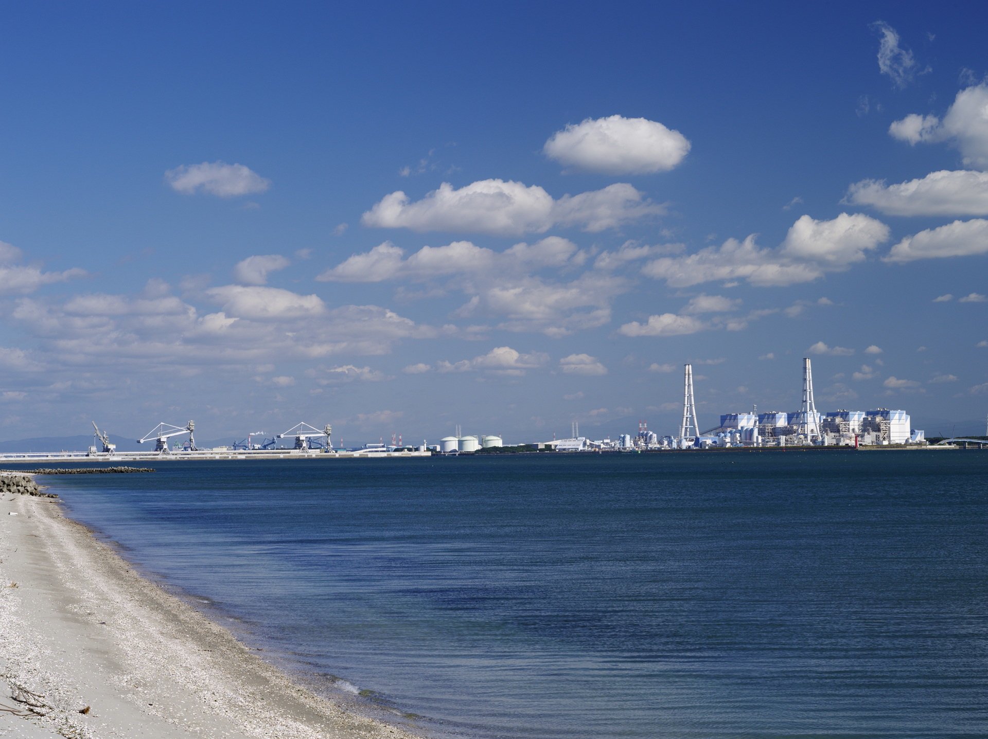 知多湾・三河湾を挟んだ対岸側に、碧南火力発電所が綺麗に観えています
