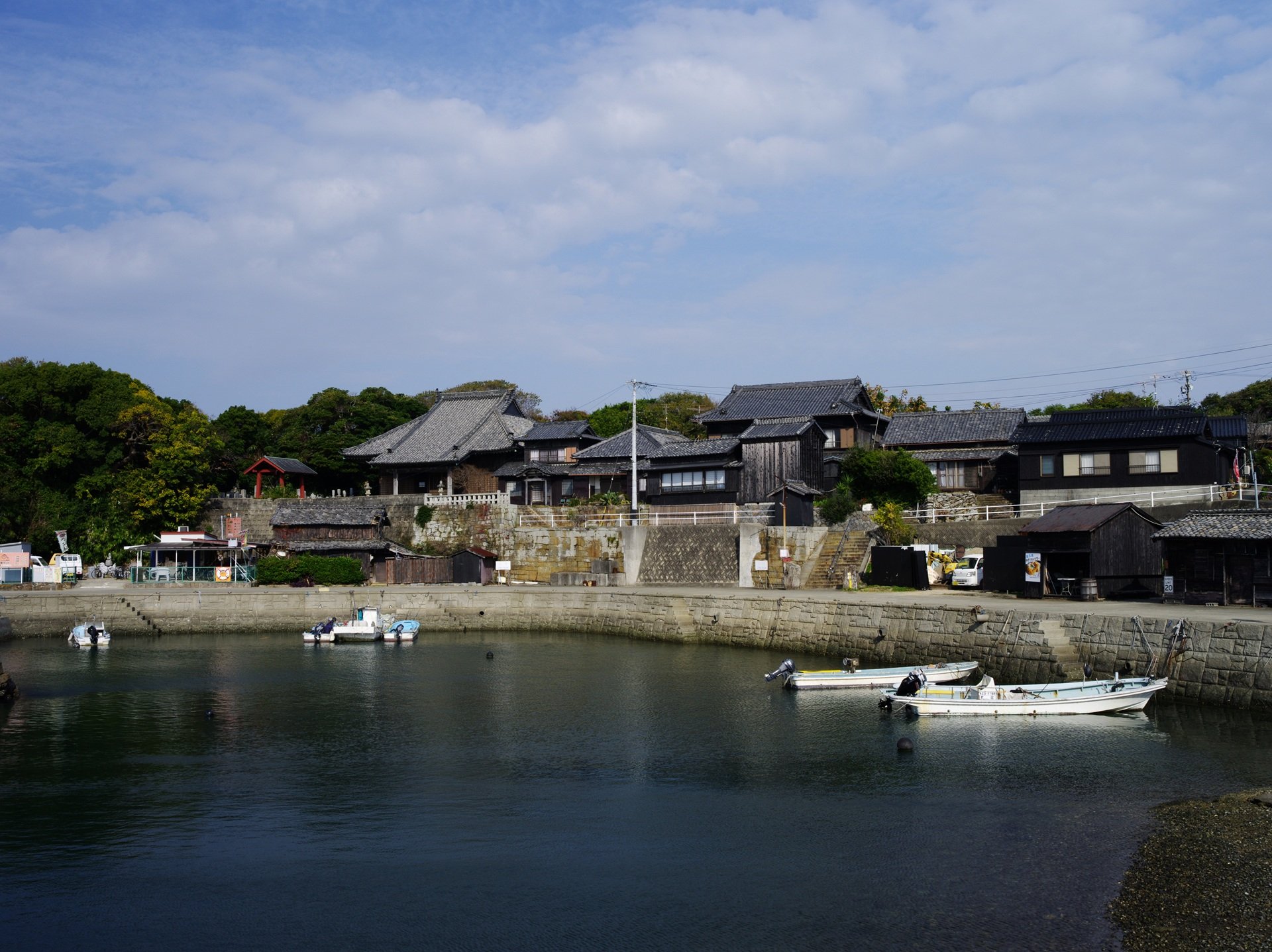佐久島西港の南側方向から、堤防に居る釣り客が誰も構図の中に入らないような撮影場所を探して、崇運寺を入れて写してみました。