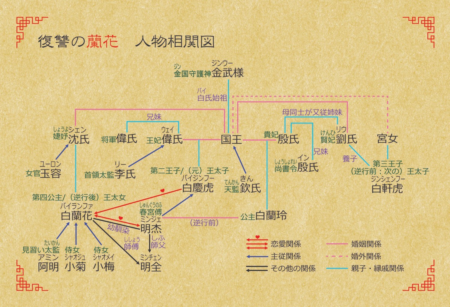 そしてとてもありがたいことに、現在連載中の中華風ファンタジー作品『復讐の蘭花』にも触れて下さっており、なななんと!!登場人物の相関図を作成して下さいました……!!(感動)