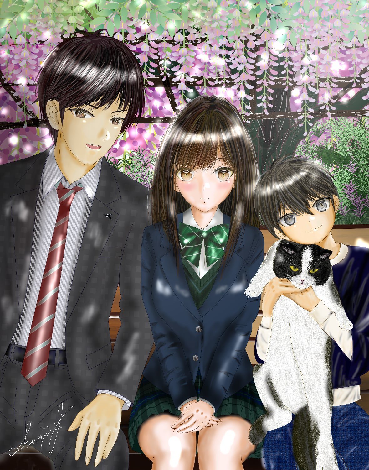 康平と、泉美と、秀樹とブチが並んで座っている絵です!!