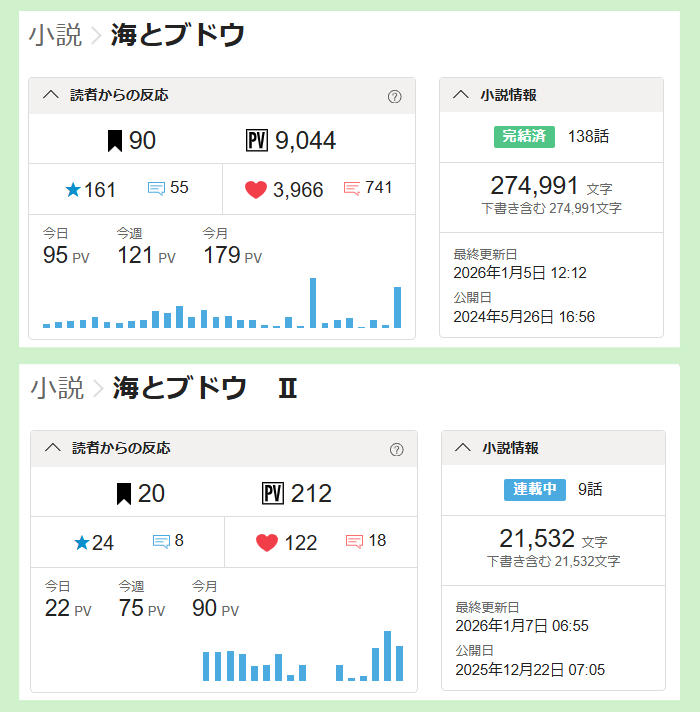 https://kakuyomu.jp/works/822139841726008991 累計PVが、それぞれ、9000、200を突破しました。