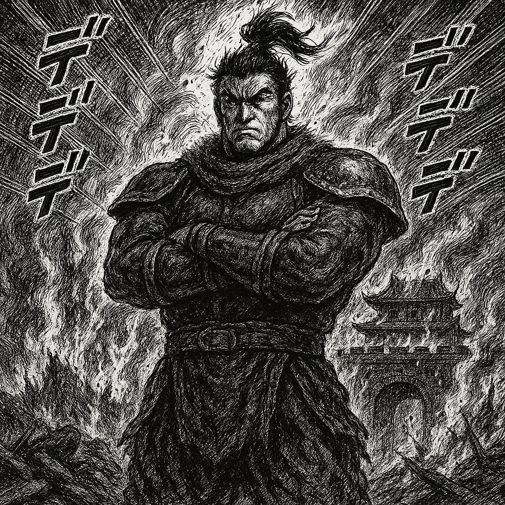 燃える洛陽城門をバックに、腕組みして登場する呂布。