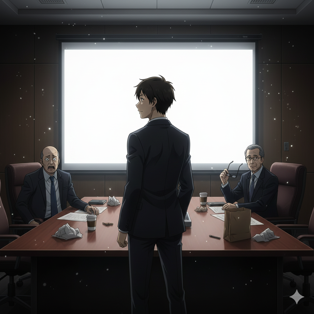 ついに会議室で上映される――。