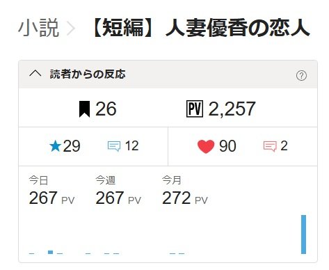 今朝第8話を公開した短編小説「人妻優香の恋人」の一日あたりのPVが、これまで私の作品では見たことがないような数字になっていて驚きました。今日の21時前でのPVが267でした。