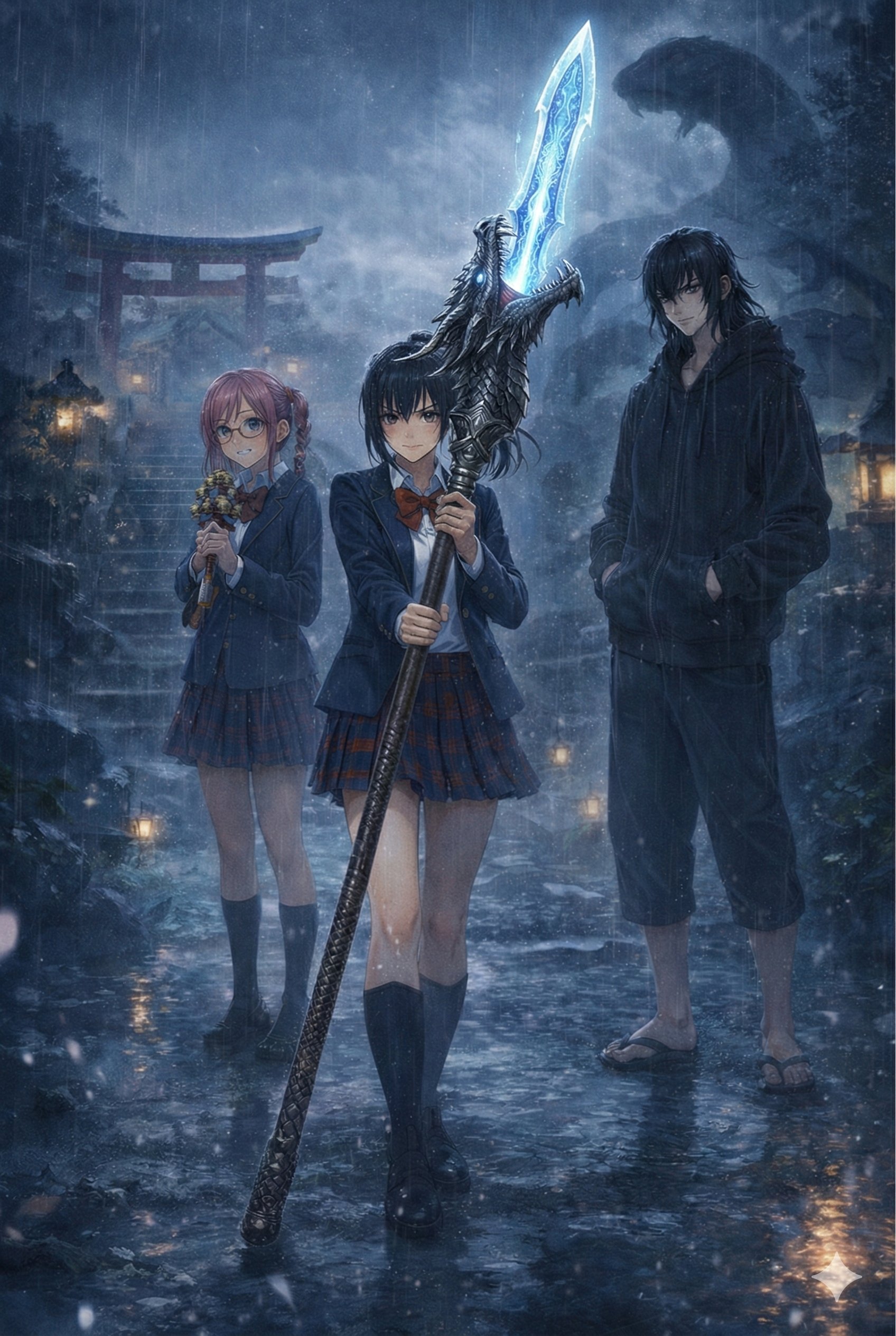 邪鎮の禊槍を構えた夕凪と神楽鈴(シングル)の千景、それとダル神オロチの3ショットです!