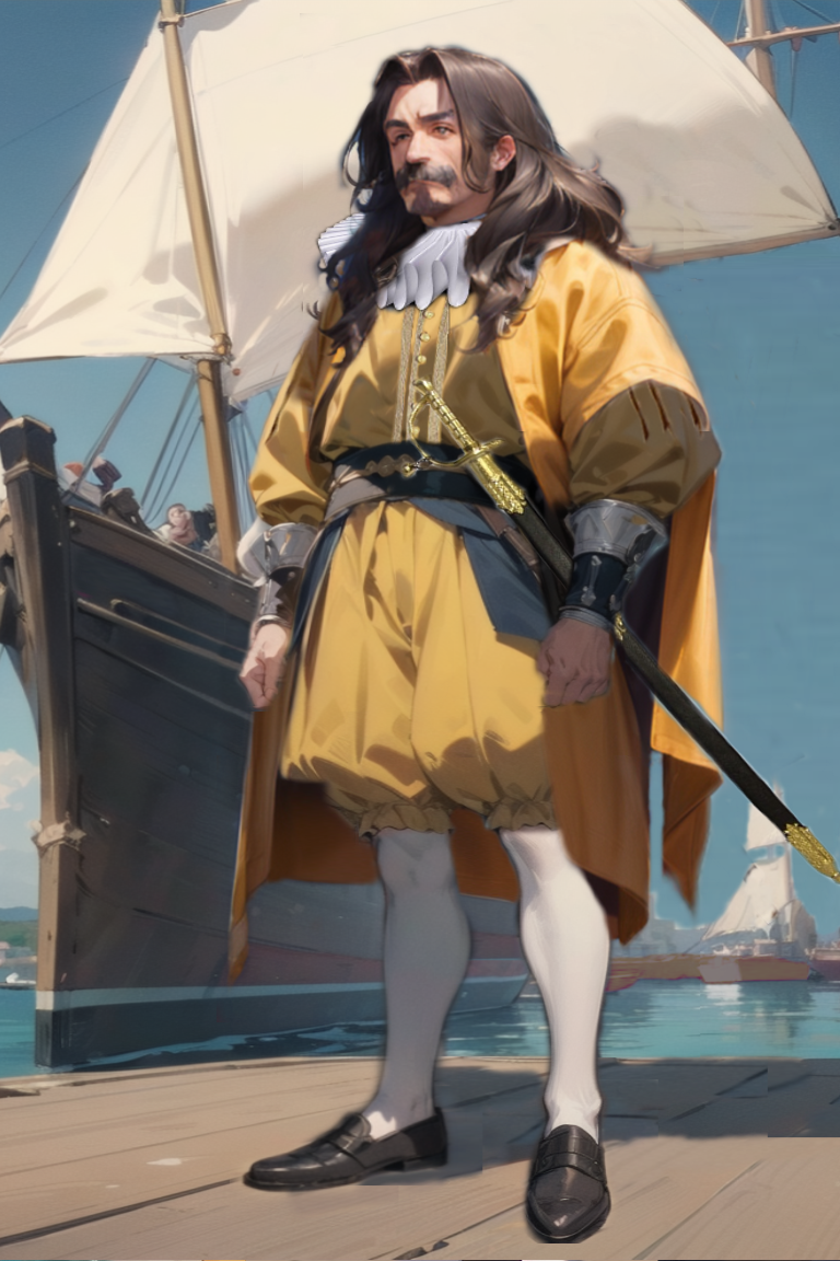 金糸の刺繍や切り込み装飾の施されたプールポワン(※上着)に、蛇腹状の大きな襞襟、黄色のキュロットにスパッツを身につける。