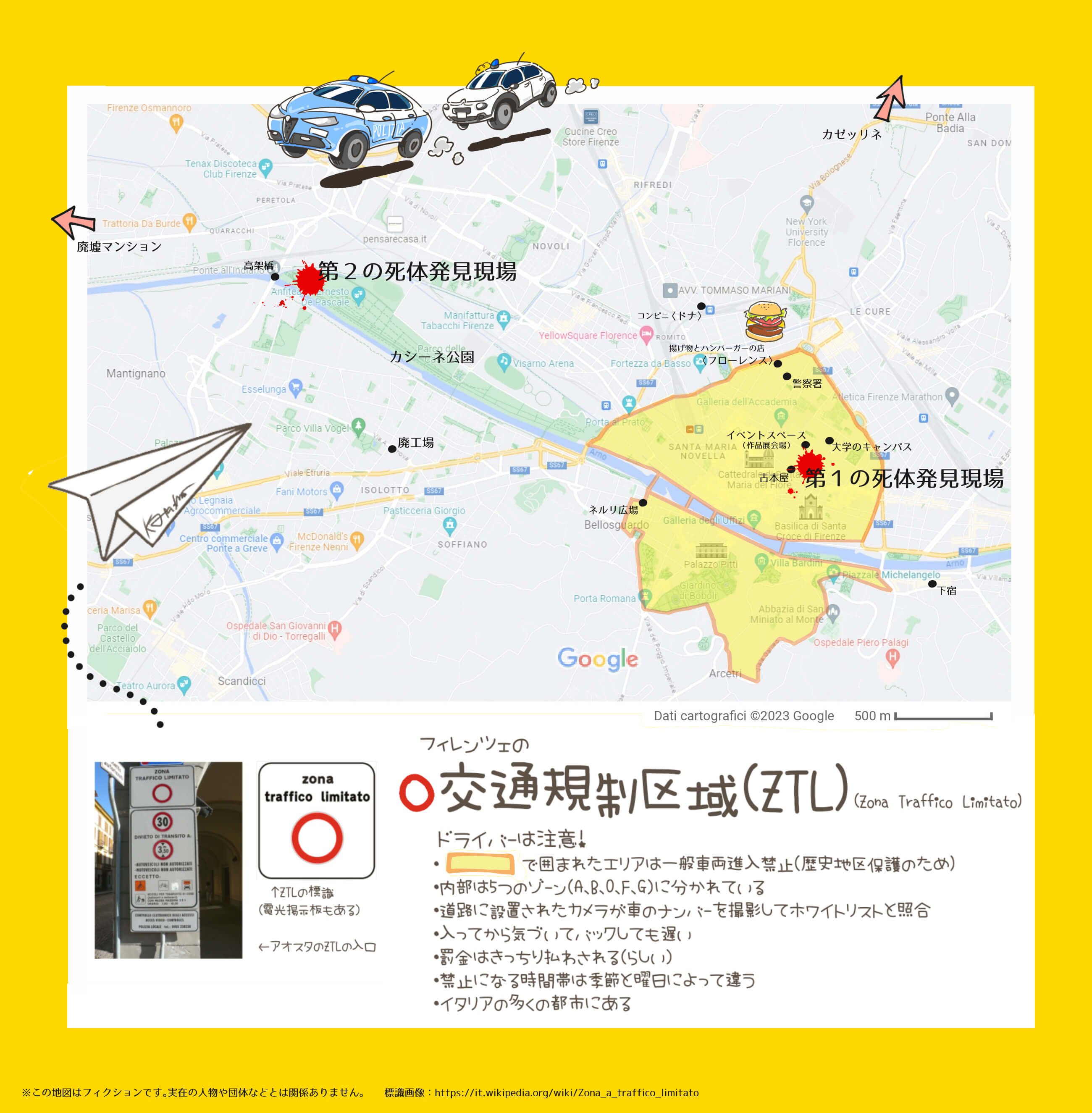 作中に登場する主な場所と交通規制区域(薄黄色のエリア)を地図に示しました。