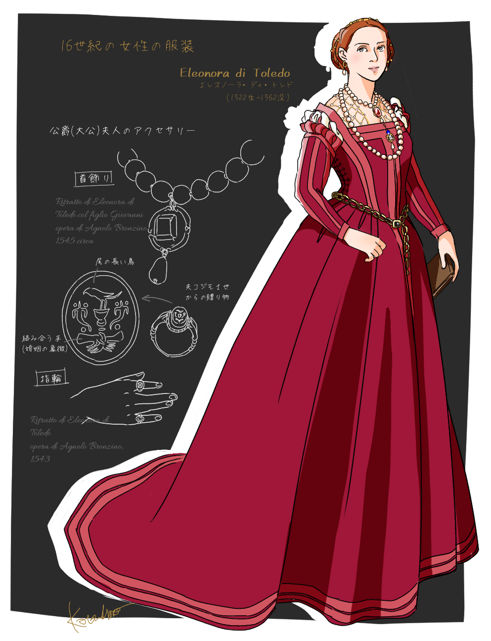 エレオノーラのドレスと言われていますが詳細は不明で、メディチ家の財産目録にも載ってないとか。でも16世紀の身分の高い女性が着ていたのは確かなのでしょう。ウエストを強調しているところが15世紀との大きな違いです。
