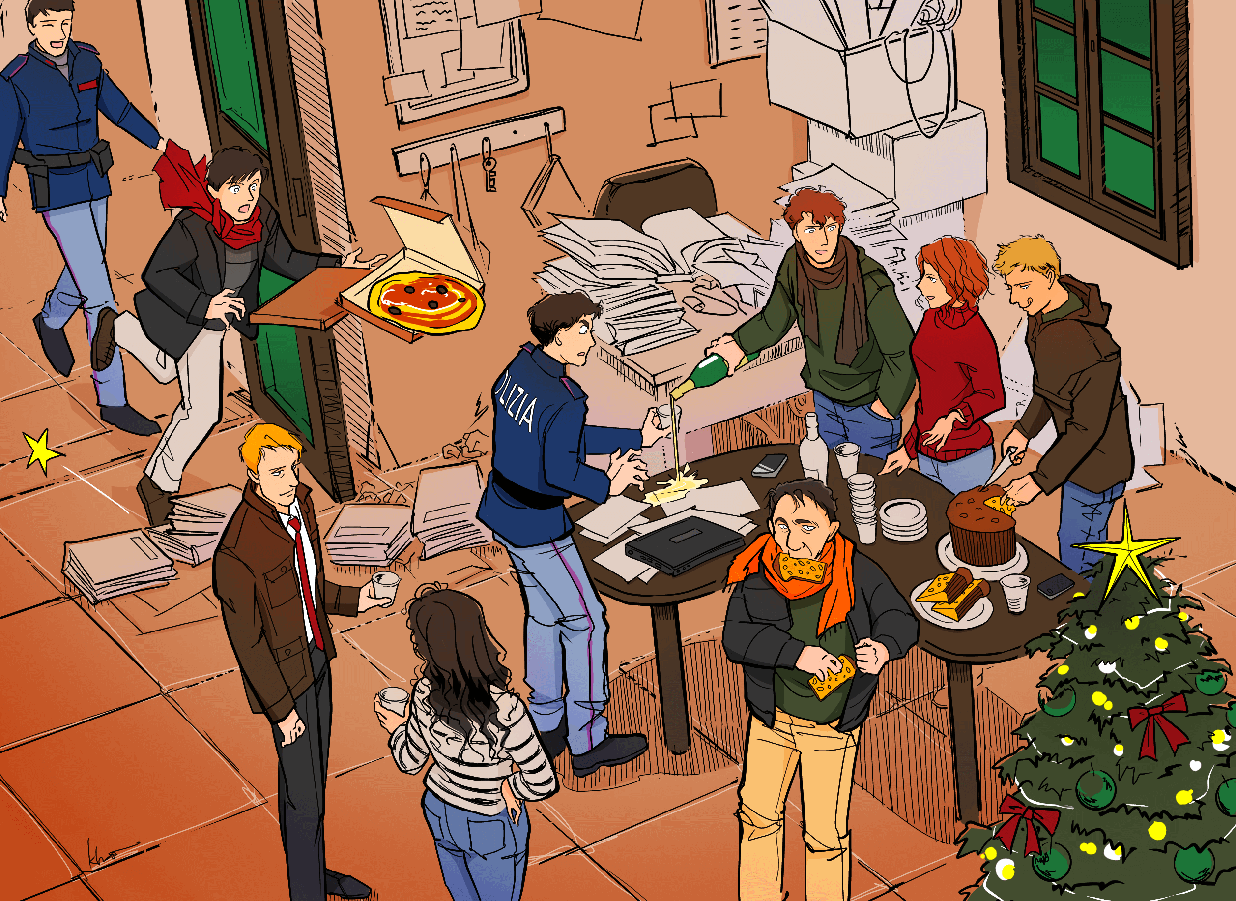 あ、一年越しの続きですね(笑)背中にPOLIZIAって書かれてると、本場って感じがしますね。誰かさんがパネトーネ懐に入れようとしてたり、ワイン滝になってたり、細かいお仕事がいいですね。隅々まで見てしまいます。