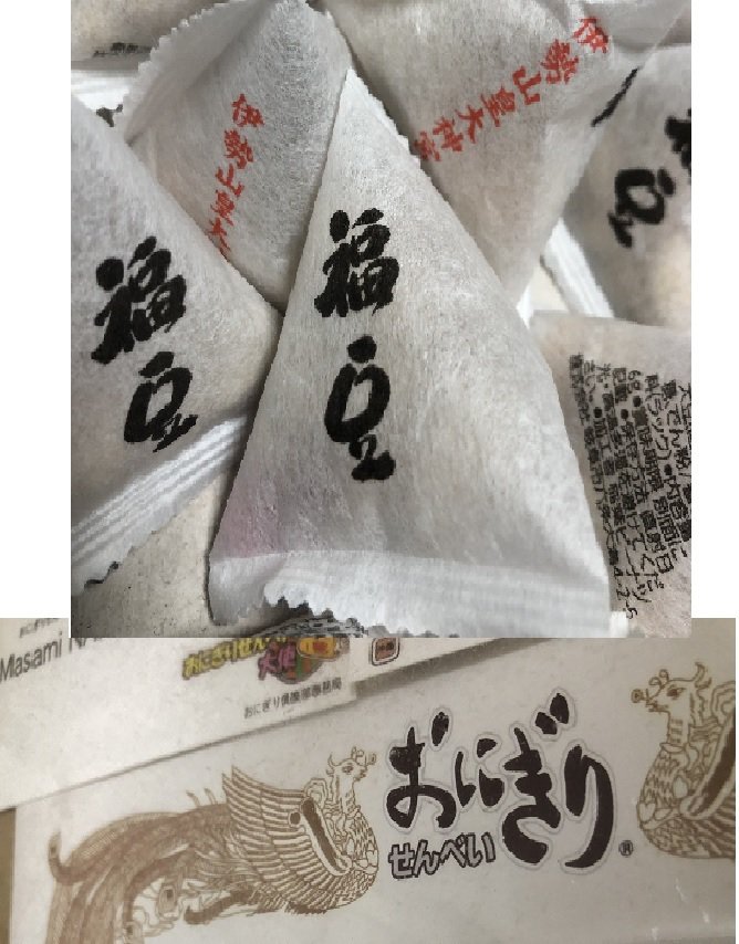 ↓今年の節分福豆とかつてのおにぎりせんべい大使の名刺と感謝状