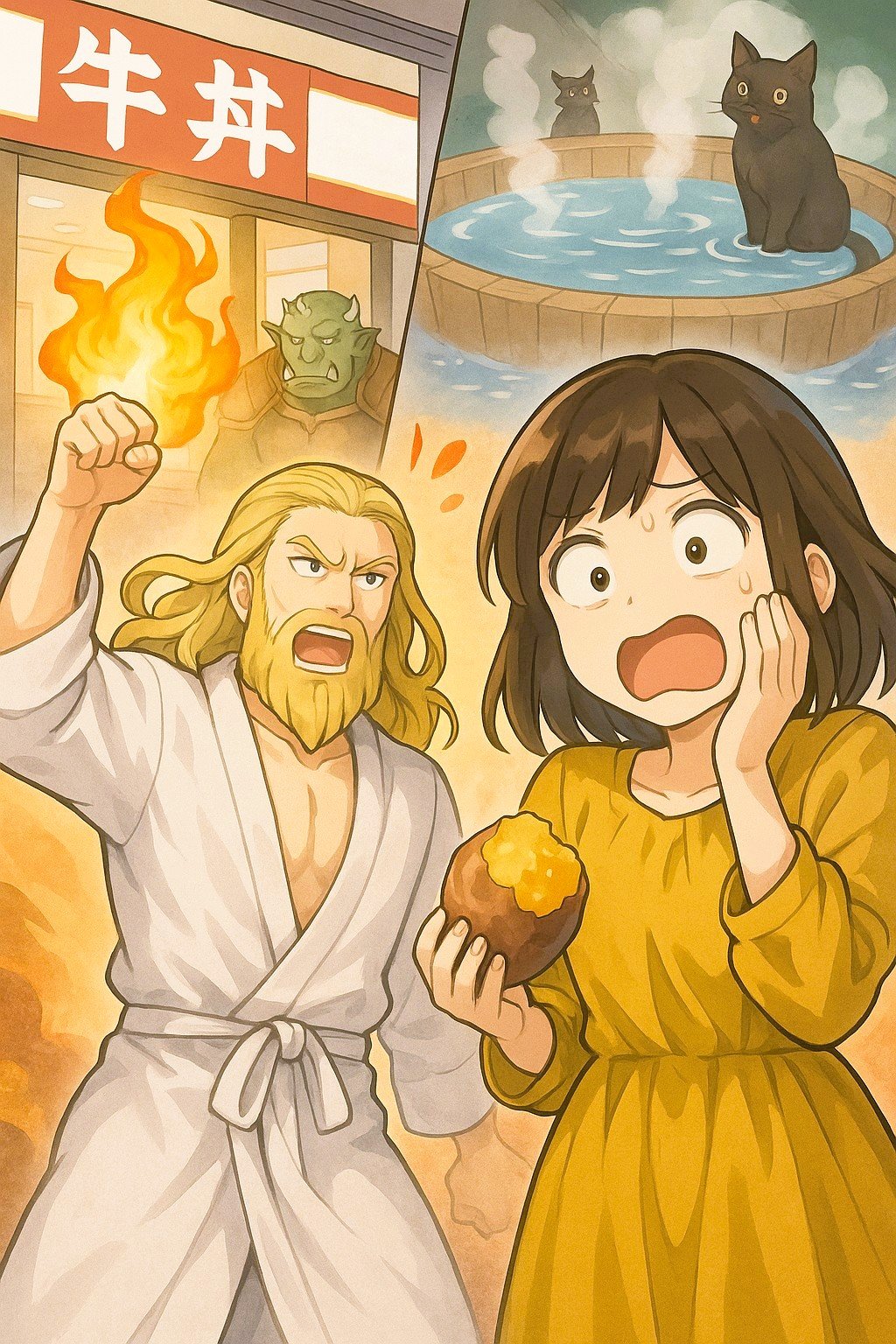 『異世界転移したらバスローブ姿で牛丼屋に放り込まれたけど、なぜか芋と温泉が神話になっていた件』 本日公開しました。