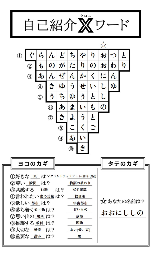 そういえばまだ私の趣味とかいろいろ話してなかったなーと思いつつ普通に言うのもなーってなったので自己紹介Xワードをしてみました