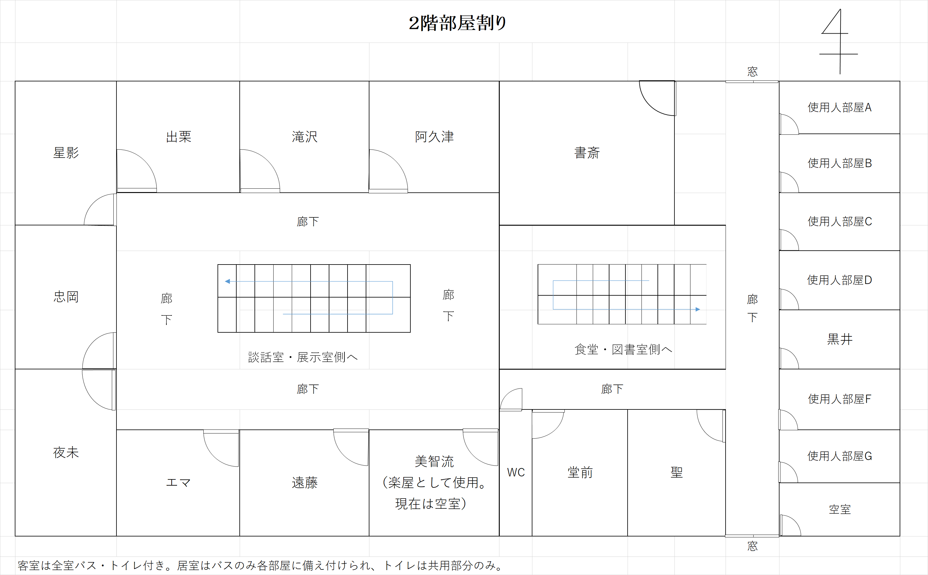 クローズドサークルミステリー「超能力の悲劇」。屋敷に留まることになった関係者たちの部屋割です。西側が宿泊客、東側が家人のスペースです。西側と東側は直接行き来できず、一旦1階に降りる必要があります。