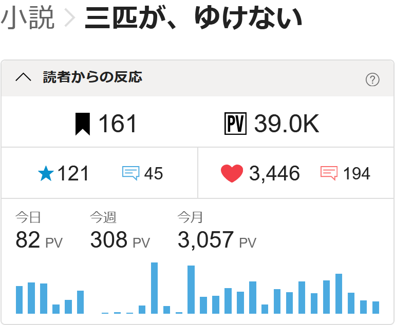 本日未明、拙著『三匹が、ゆけない』の累計PV数が39000PVに到達いたしました。誠にありがとうございます。