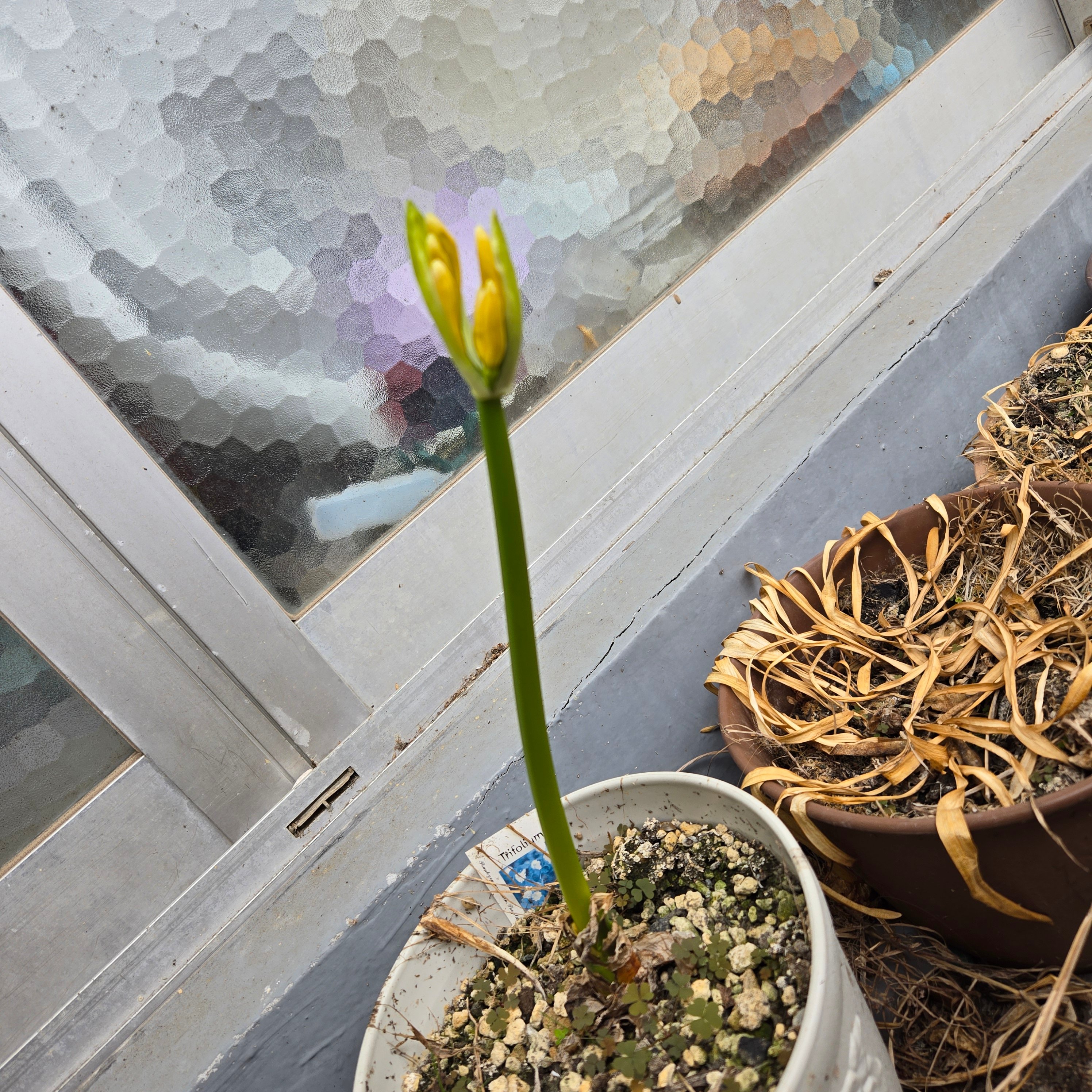 入退院を繰り返した挙句、自室に居ても寝込んで彼岸花枯れたかと思っていましたが、一輪だけ生きていてくれました。もしかしたら、分球しやすくなると思って、一鉢に一つの球根にしていたのが良かったのかもです。(分球は残念ながらなかったですが、この状況で生きていてくれたのが奇跡だと思います)