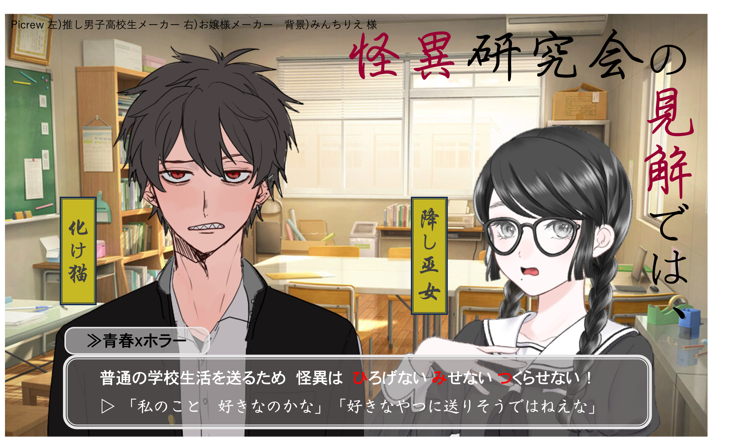 イラストはピクルーで作成したものですが、ホラーノベルゲーム風のコンセプトがありました。
