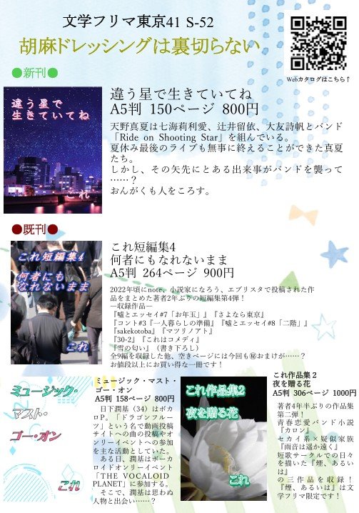 新刊『違う星で生きていてね』に加え、既刊3冊を頒布します。