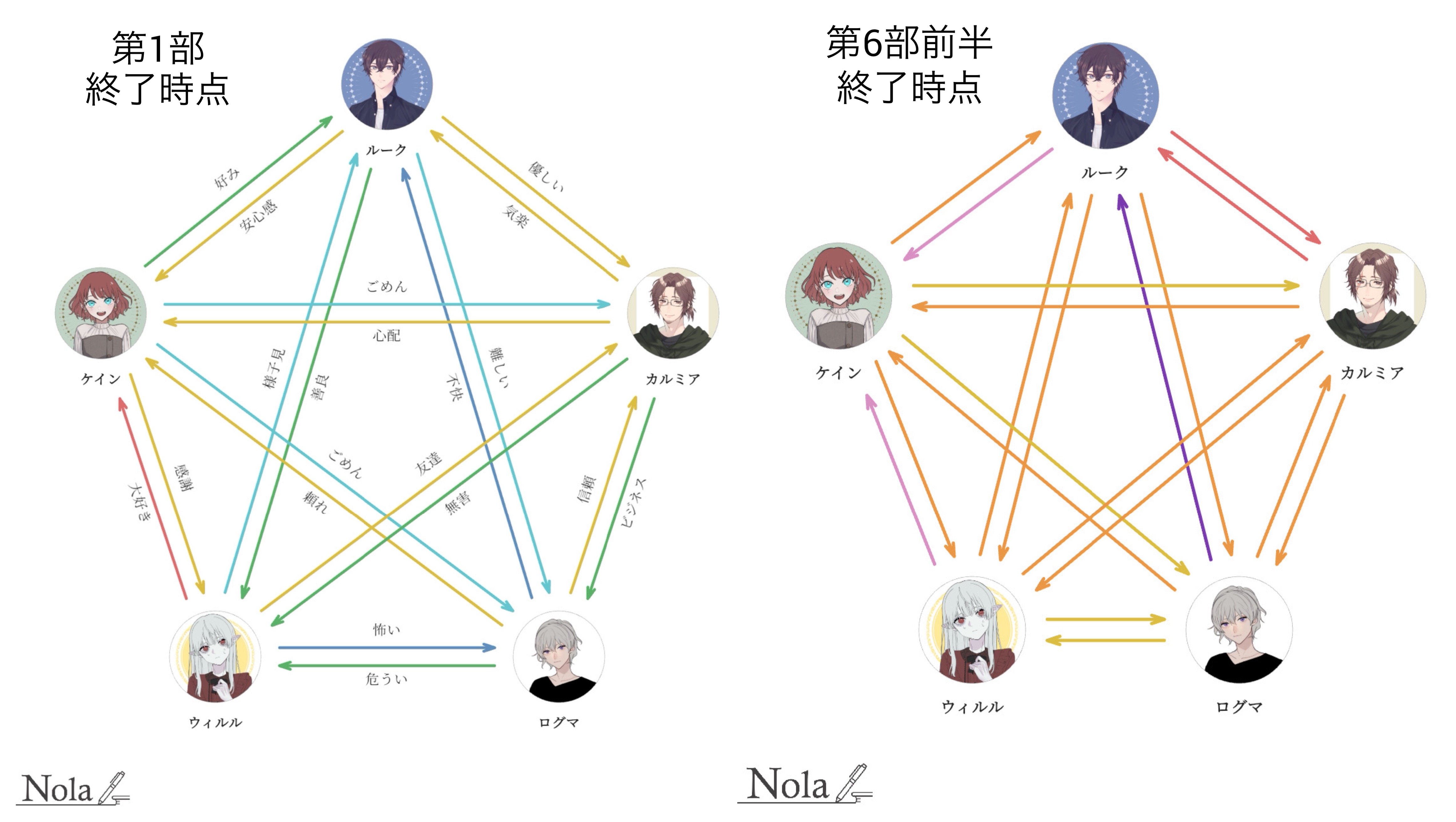 おまけで、第1部終了時点と第6部前半(33章まで)時点でのメインキャラ相関図比較を置いておきます。設定資料の一部です。