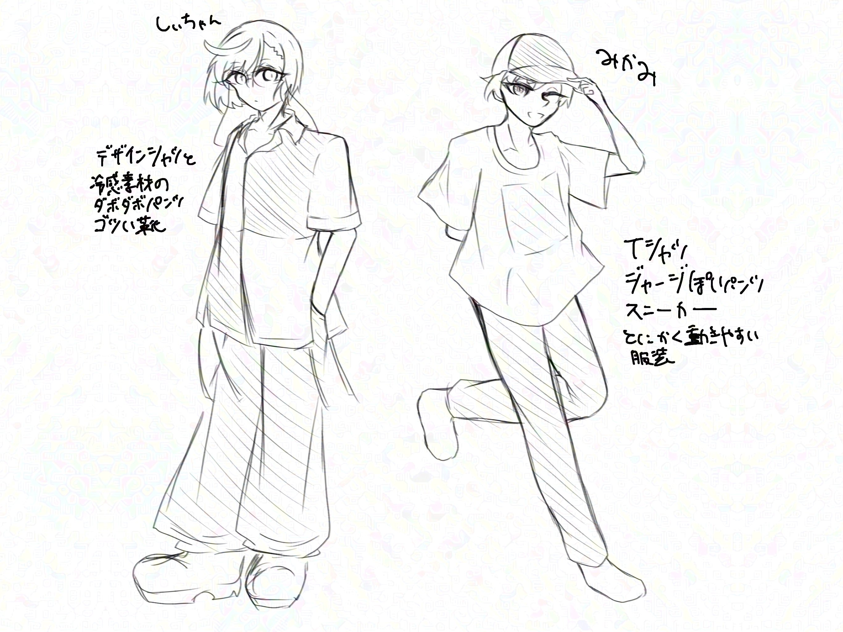 ちょっと重たい話になってしまいましたが、久野と雀居の夏服絵です。