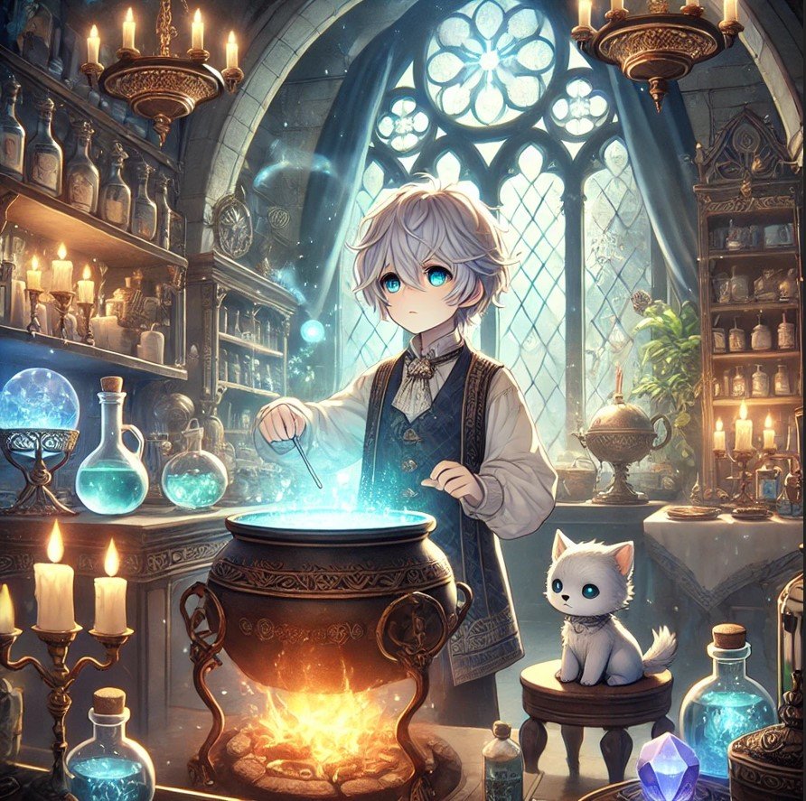 4歳のレオンハルトがが錬金術をしている姿を描きました。銀髪のショートヘアで、隣には木製の狼のおもちゃがいます!!!!!!
