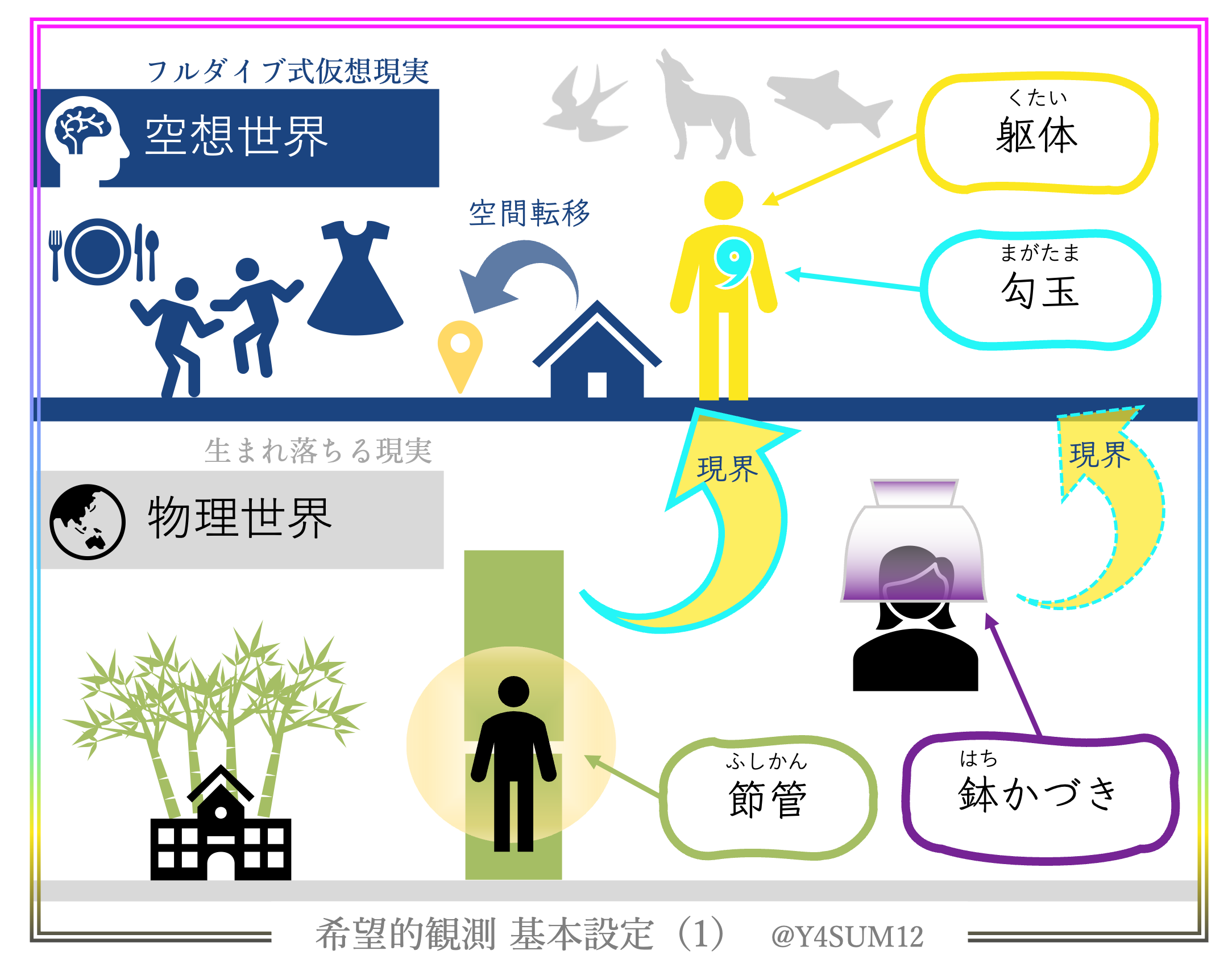 生まれ落ちる現実「物理世界」と、フルダイブ式仮想現実「空想世界」があります。
