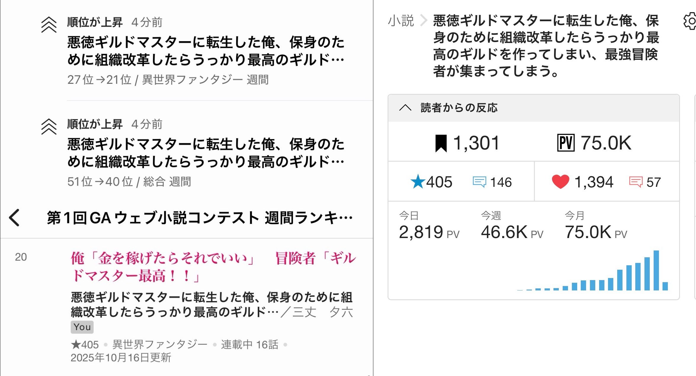 がカクヨム週間総合ランキング40位、異世界ファンタジー21位、GAウェブ小説コンテスト20位になりました。お読み頂き本当にありがとうございます。