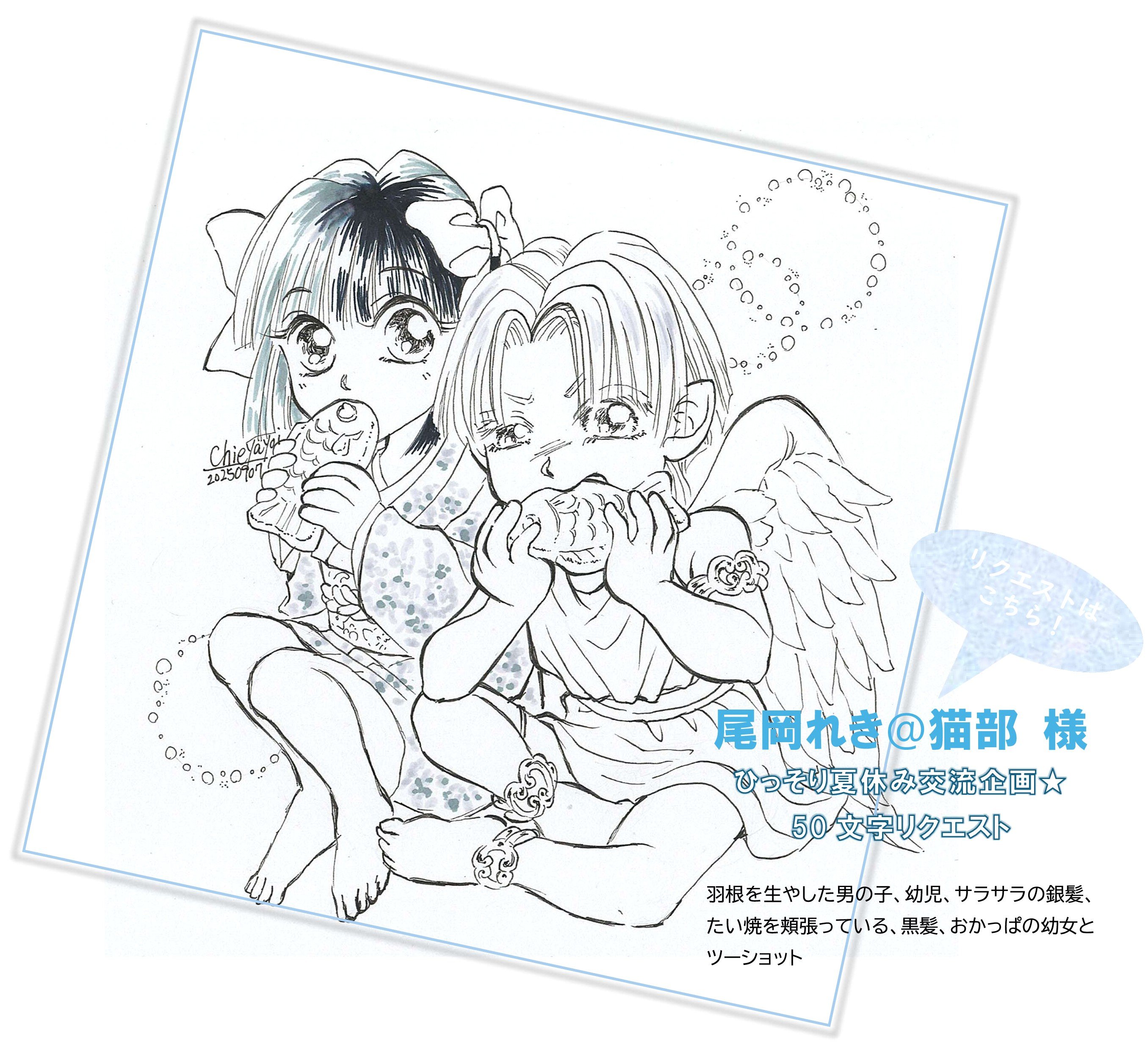 羽根を生やした男の子、幼児、サラサラの銀髪、たい焼を頬張っている、黒髪、おかっぱの幼女とツーショット