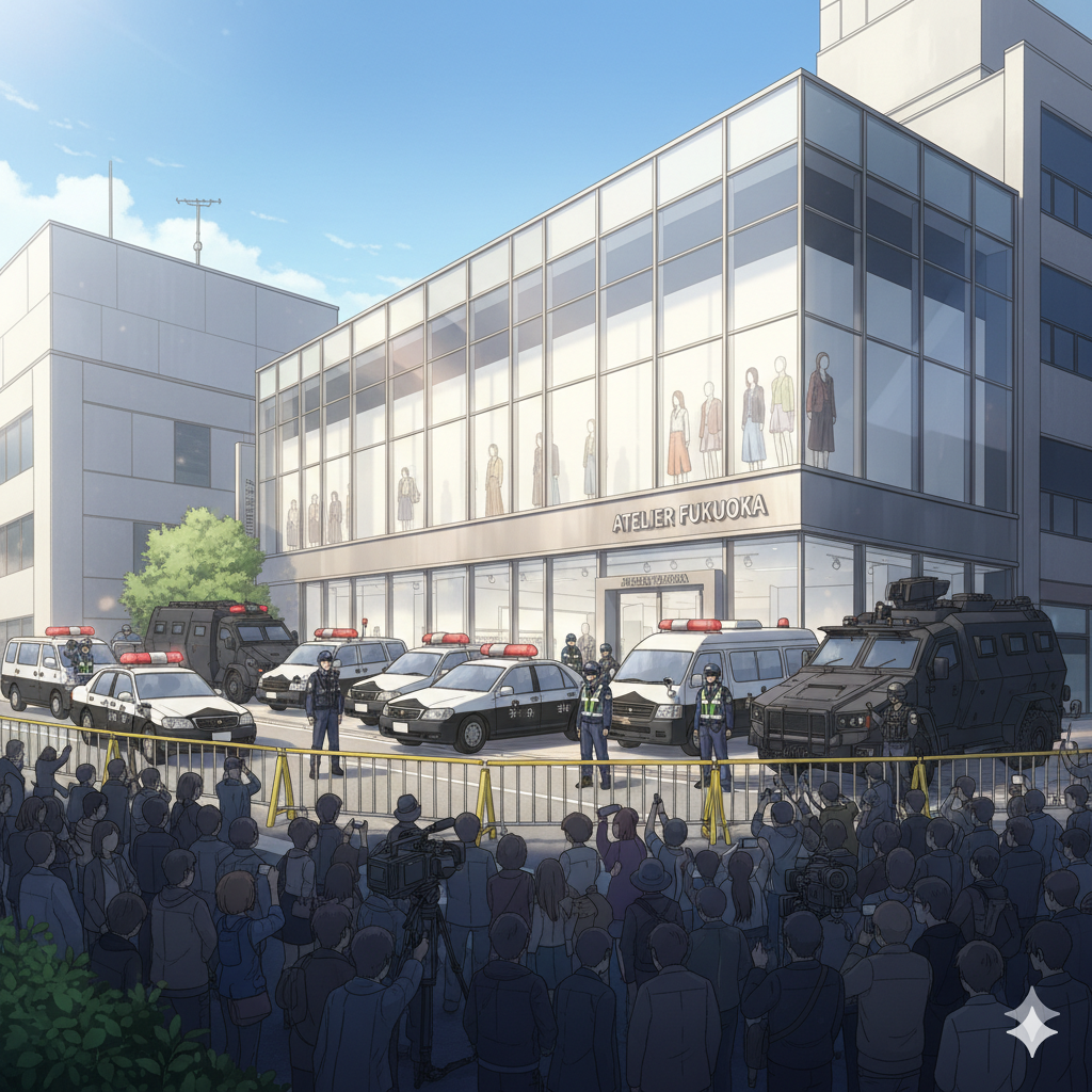 ※ Gemini生成の小説画像。アトリエを取り囲む警察の機動隊とマスコミ。