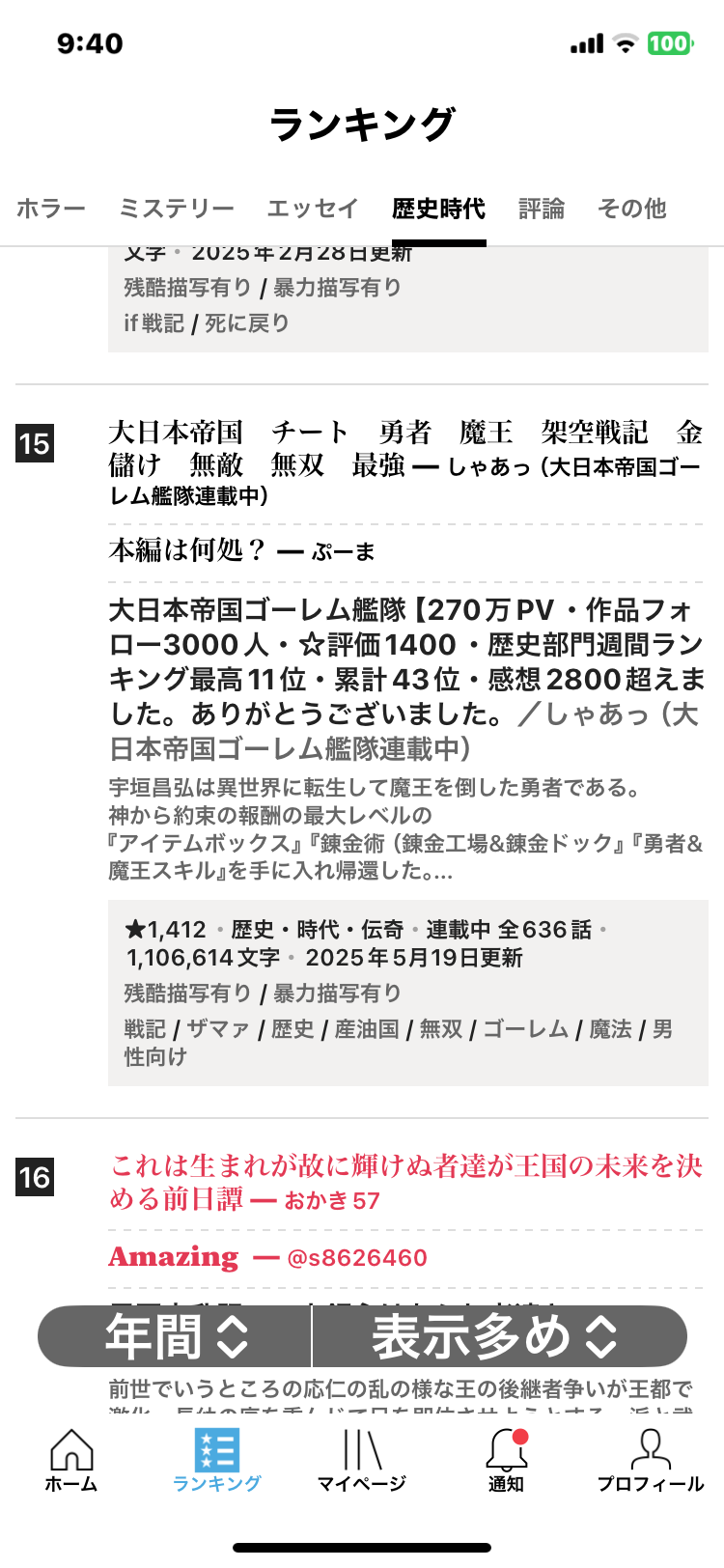 なんと、大日本帝国ゴーレム艦隊が歴史部門の年間ランキングで15位に上がる