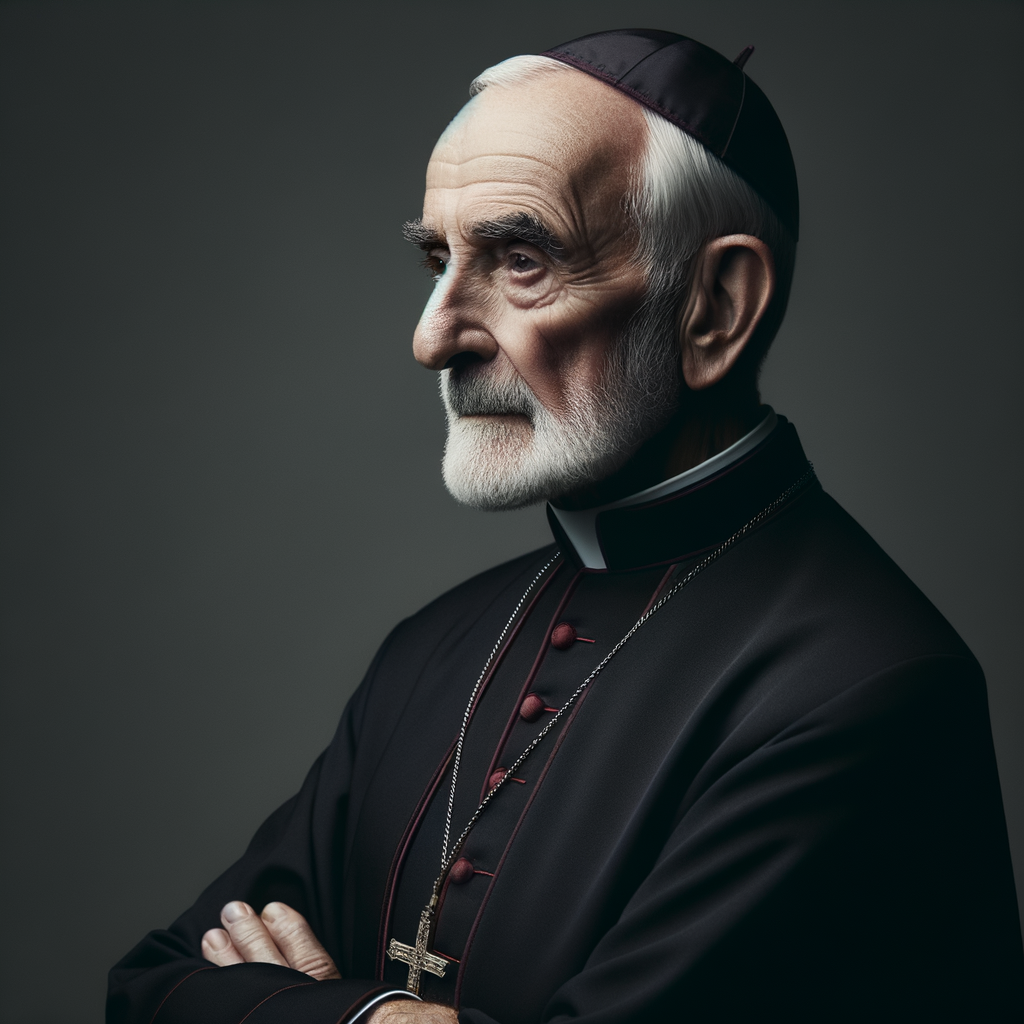 形と色は共通ですが、赤紫色のボタンと縁取り、頭の帽子は司教のものです。