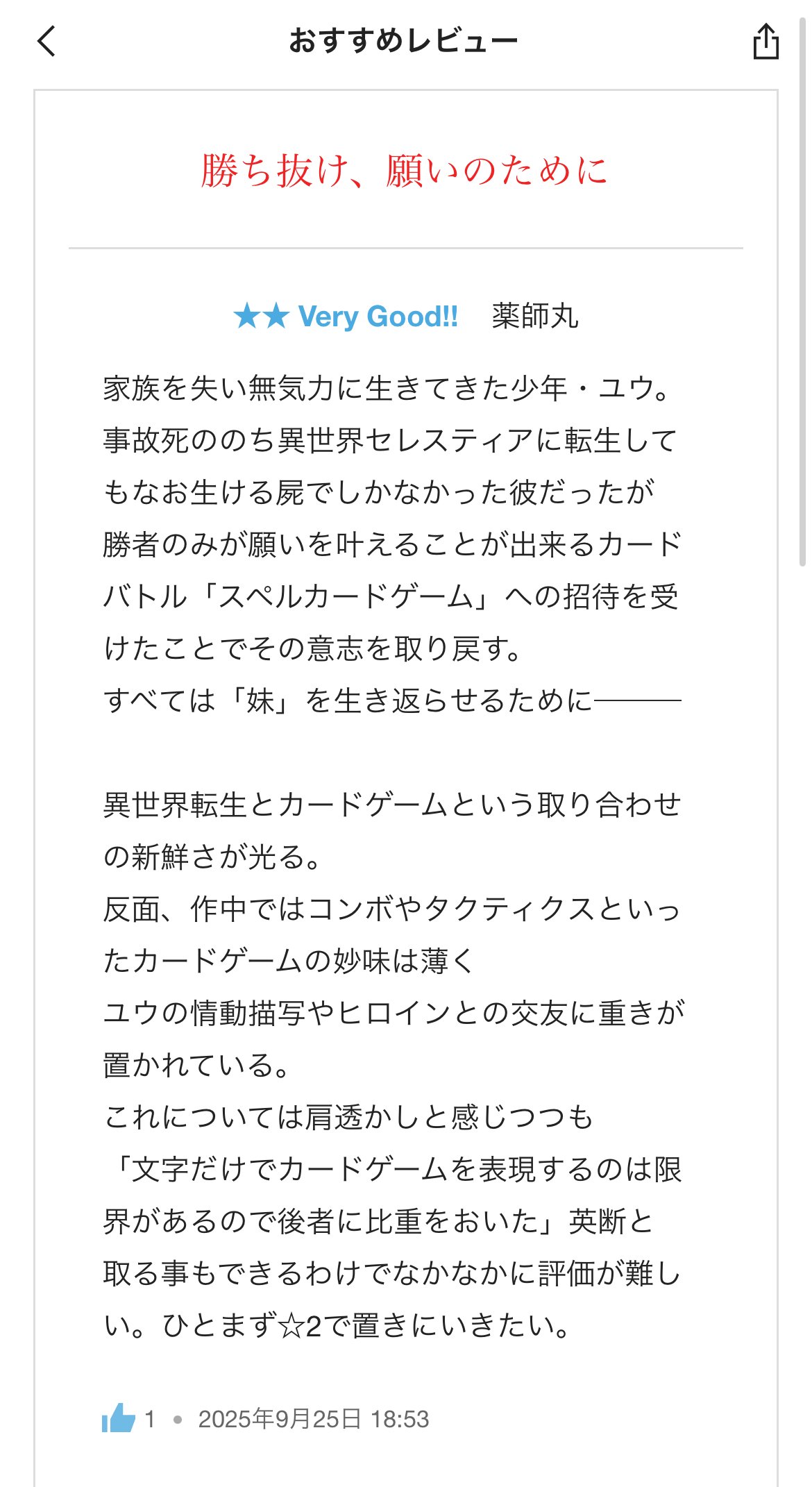 薬師丸様から私の作品におすすめレビューをいただきました😊