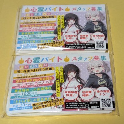 心霊バイトの世界観に没入できる、なんか本当にありそうな『求人広告風チラシ入りポケットティッシュ』です!