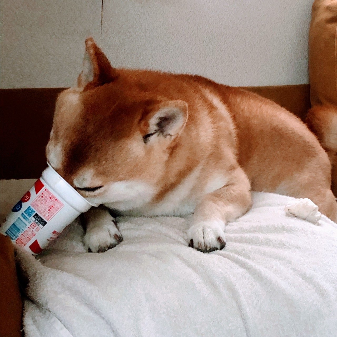 愛犬は4歳の柴犬のオスで、ヨーグルトの入れ物に顔を突っ込んで舐めているところです。いやしいやつだなあ。