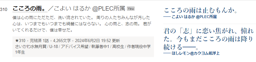 あ、そういえばですね、恋愛の短編の累計ランキングで「こころの雨。」が310位に入ってたんですよ!!