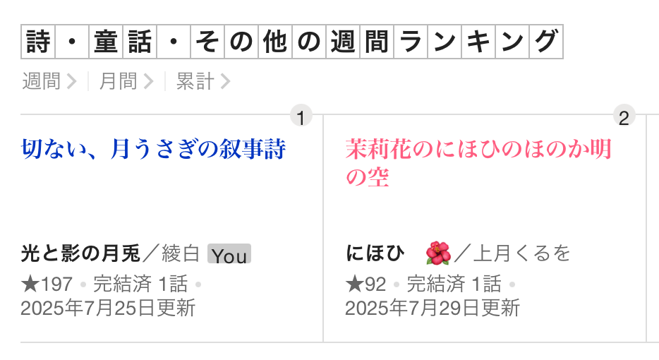 「光と影の月兎」が、詩ジャンル週間1位になりました。