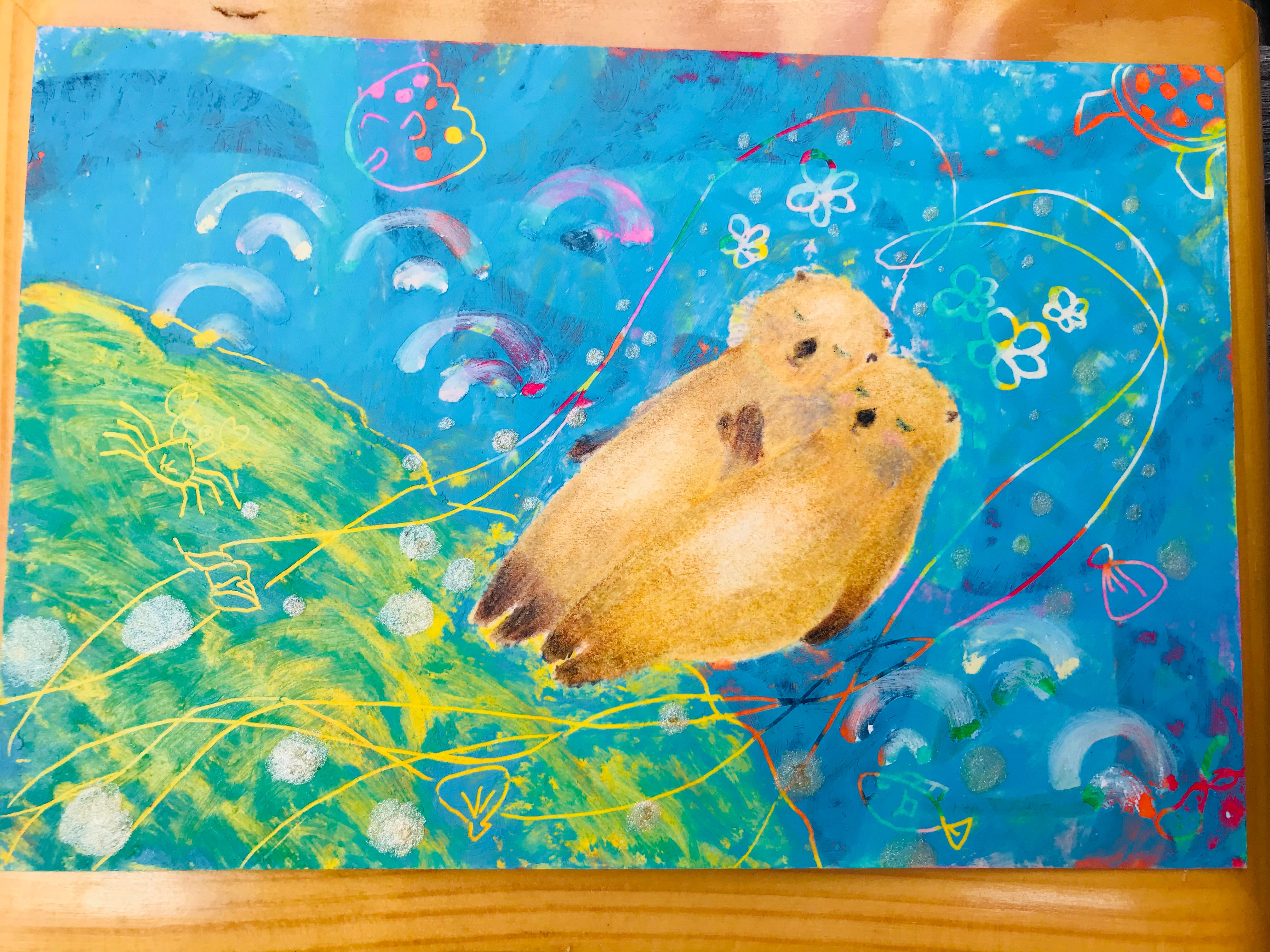 クレヨン、色鉛筆、水彩、キラキラした何か、が使われたハガキサイズ大のもの。