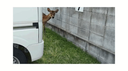 鹿、車の陰からひょっこりはんみたいに覗いて可愛い💕