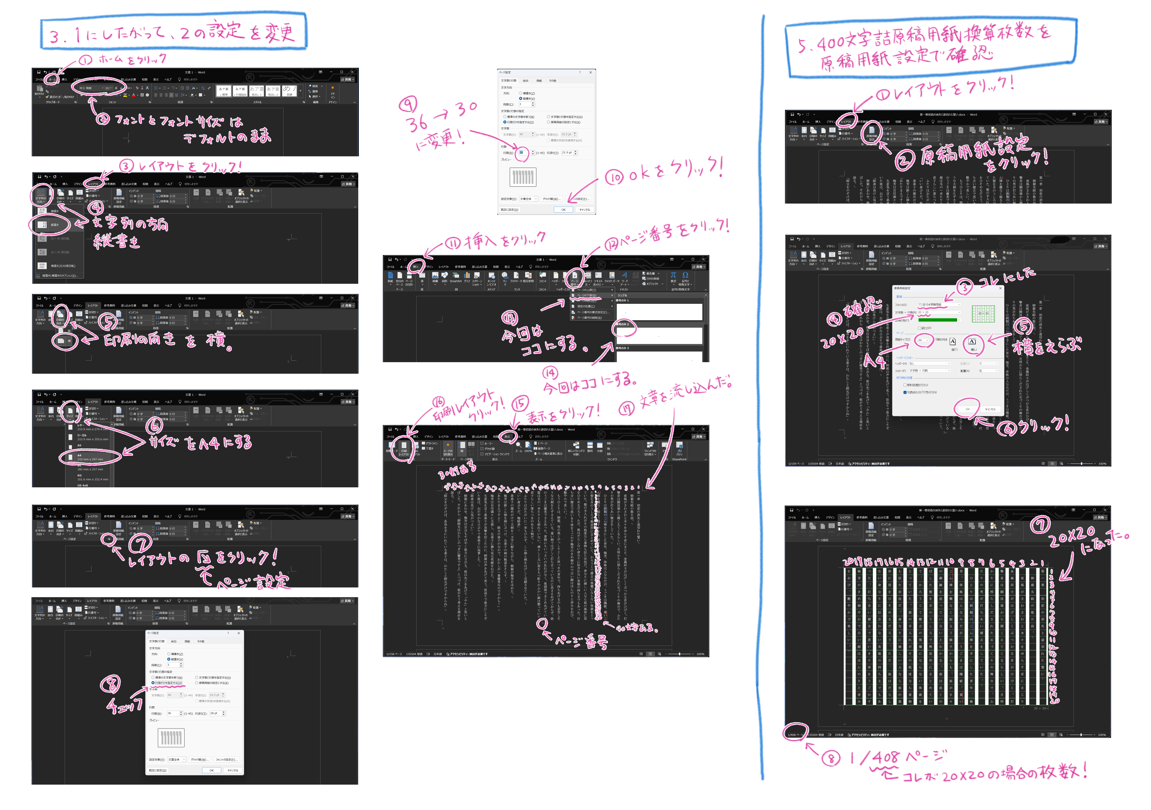 具体的な手順は、この近況ノートの添付画像を参照。『3.1にしたがって、2を設定を変更 』と『5.400字詰原稿用紙換算枚数を原稿用紙設定で確認 』を画像化してます。