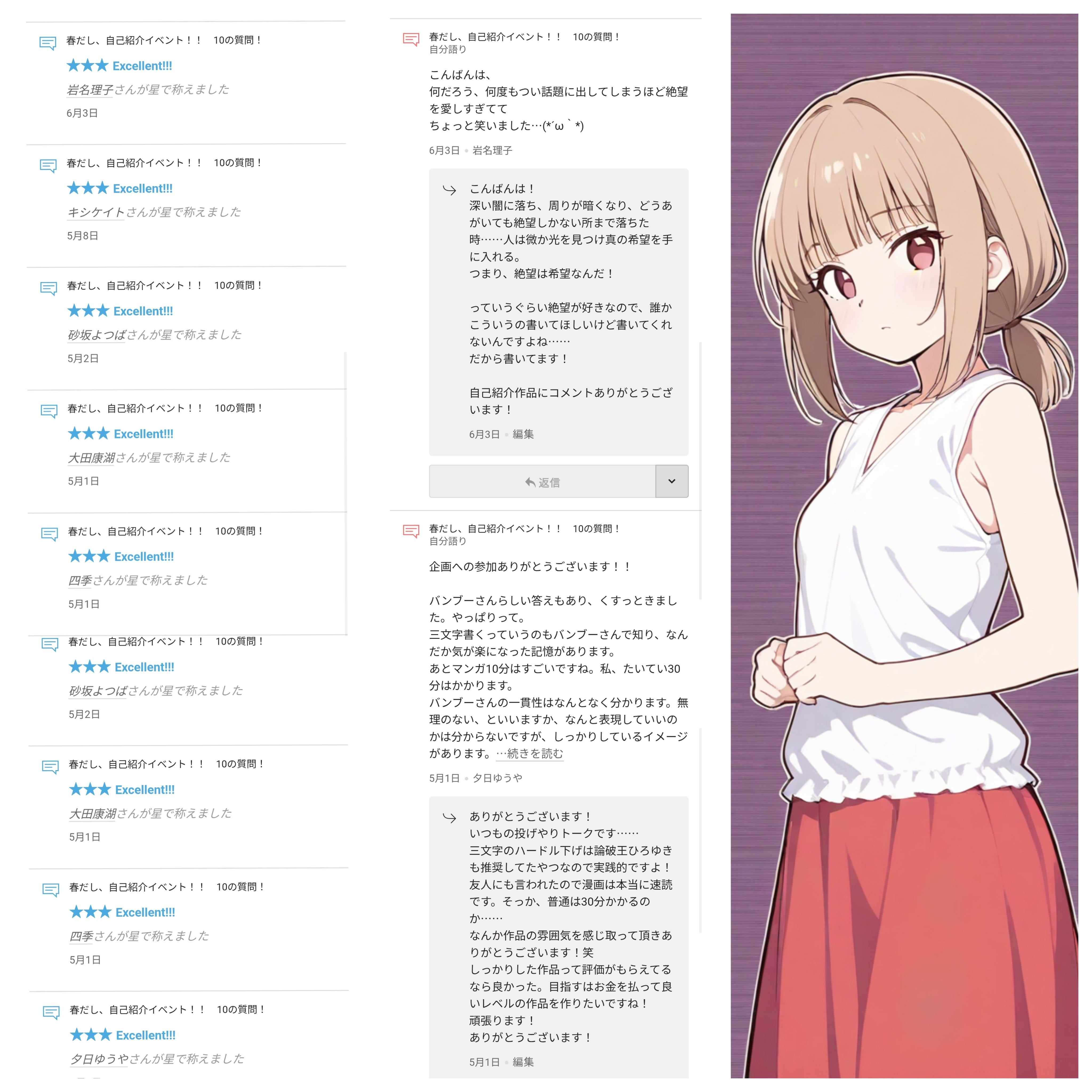 以前行った夕日ゆうや様の企画、「春だし、自己紹介イベント!! 10の質問」のエピソードを消去し近況ノートに移動します。