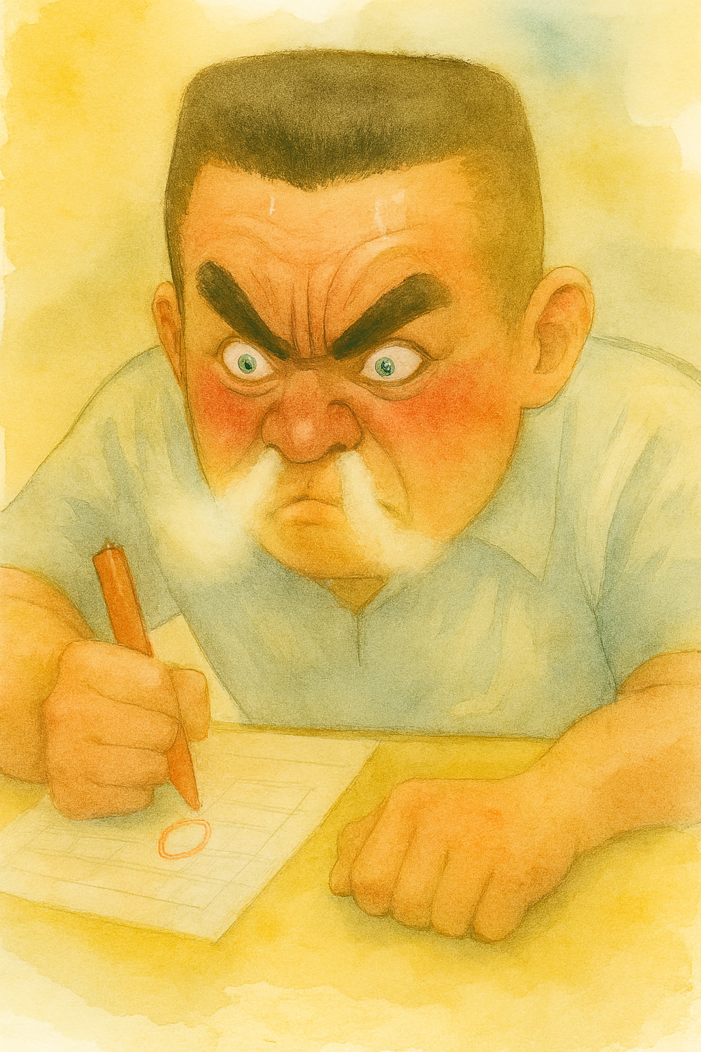 チラリと左隣へ視線を向けると、体育教師が眼球が飛び出してしまいそうなほど血走らせた目を見開き、太い眉毛を逆八の字にして額には青筋を何本も浮かび上がらせ、モザイク推奨の表情で激しく鼻呼吸させて、グーで握った赤ペンを走らせていた。