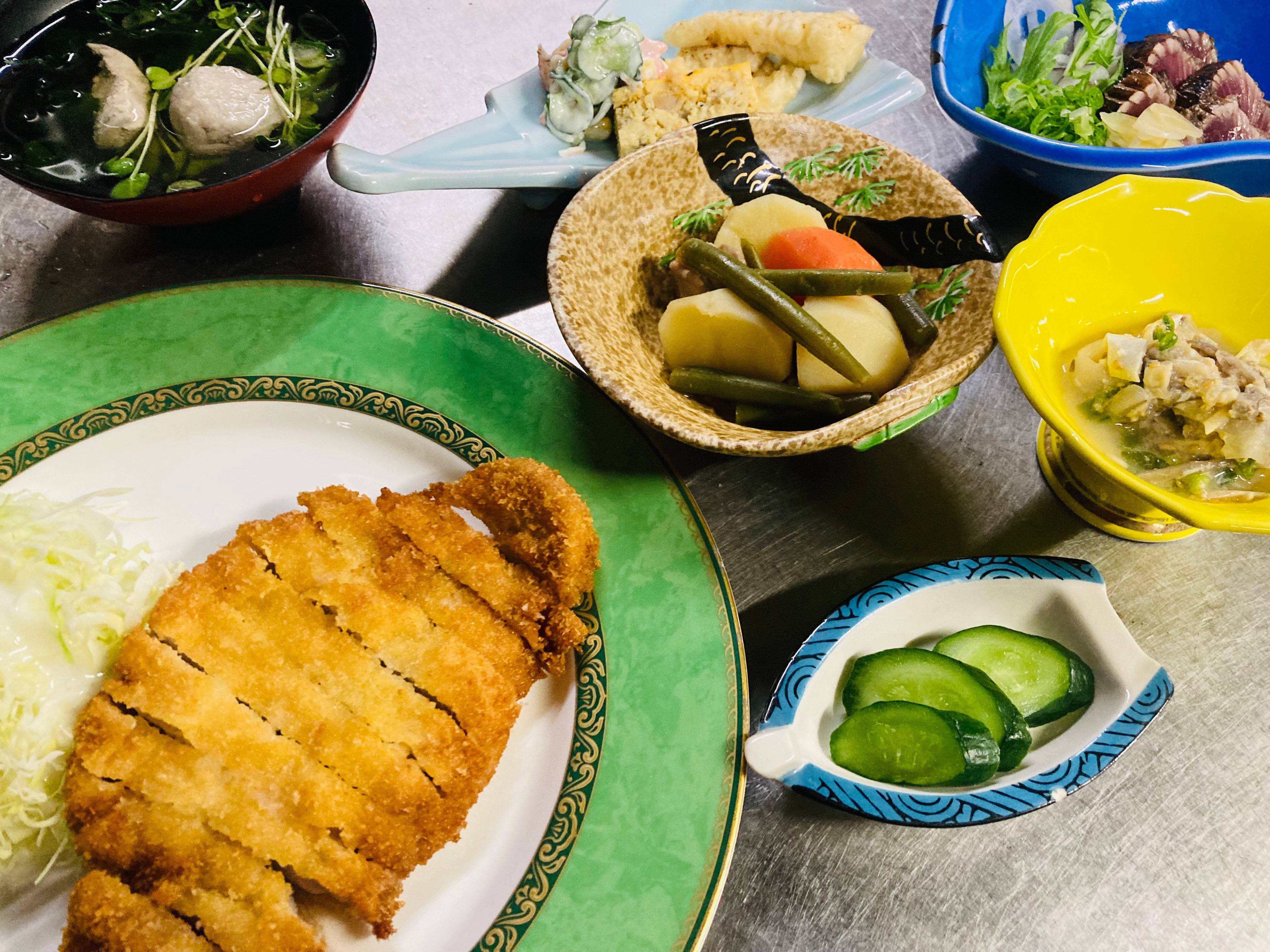 蒸しタマゴ、たけのこ天ぷら、カニカマサラダ